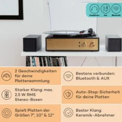 State of the Art verschmilzt mit guter alter Analog-Schule: Das auna 388-BT Wood Hifi System ist klassische Musikanlage und High-Tech-Wiedergabegerät in einem. Ausgestattet mit dem vollen Repertoire an altbewährten Audio-Abspielgeräten, wie Plattenspieler, CD-Player und zwei Kassettendecks für deine ganze Musikbibliothek, weiß die auna Kompaktanlage aber auch mit MP3s professionell umzugehen.