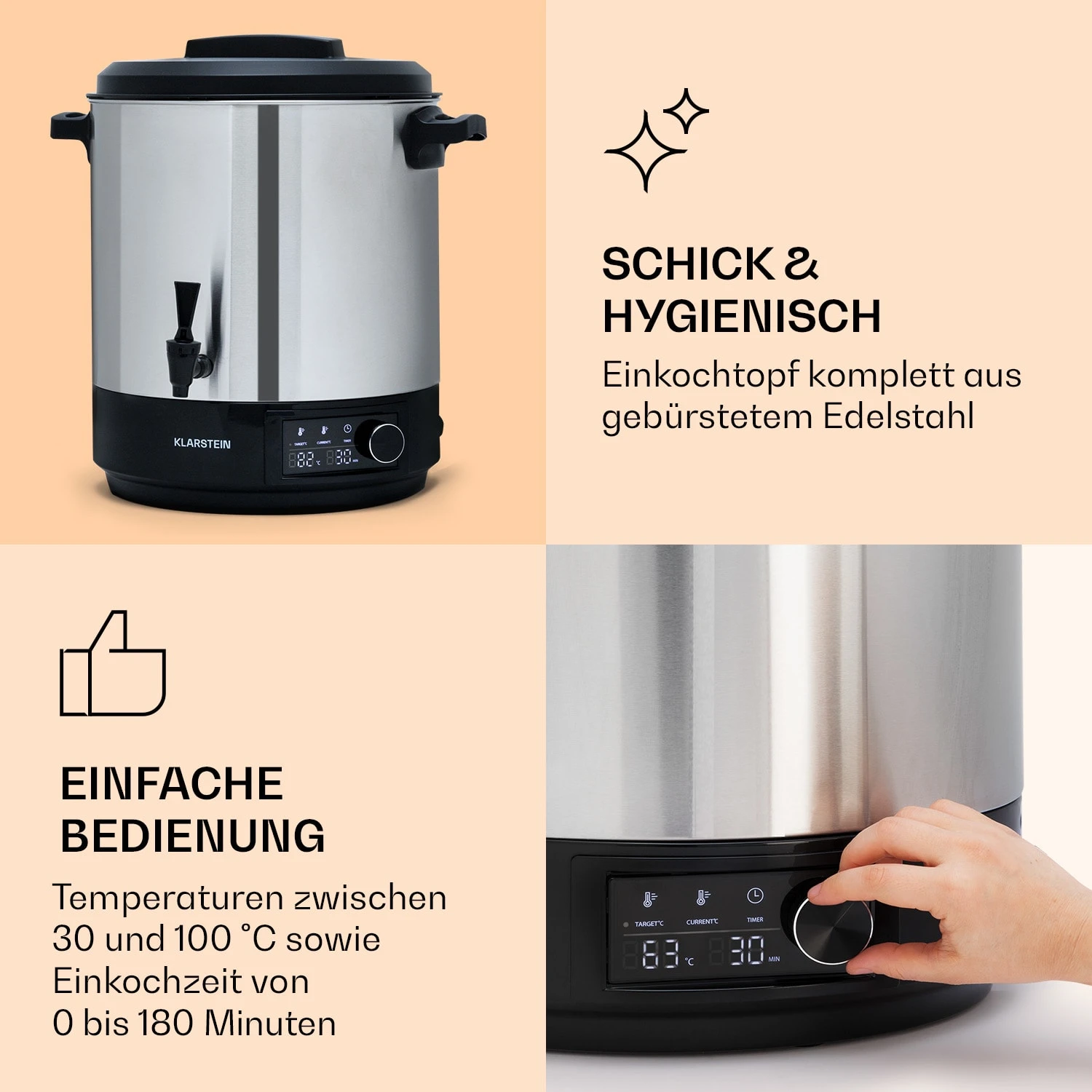 Heute wird gekocht, eingekocht! Mit dem Klarstein Abbey 25 Einkochtopf kommt Abwechslung auf den Speiseplan – mit Langzeiteffekt. Der 25 Liter große Einkocher bietet genug Platz, um den Inhalt deiner Einkochgläser mit Hitze in haltbare Konserven zu verwandeln. Egal ob die Obst- oder Gemüseernte, süße Marmeladenkreationen, herzhafte Wurstmasse oder fertig zubereitetes Gulasch, Braten und Rouladen – im Abbey 25 werden sie, dank wählbarer Temperatur von 30 – 100 °C und Einkochzeiten bis 180 Minuten, haltbar gemacht.