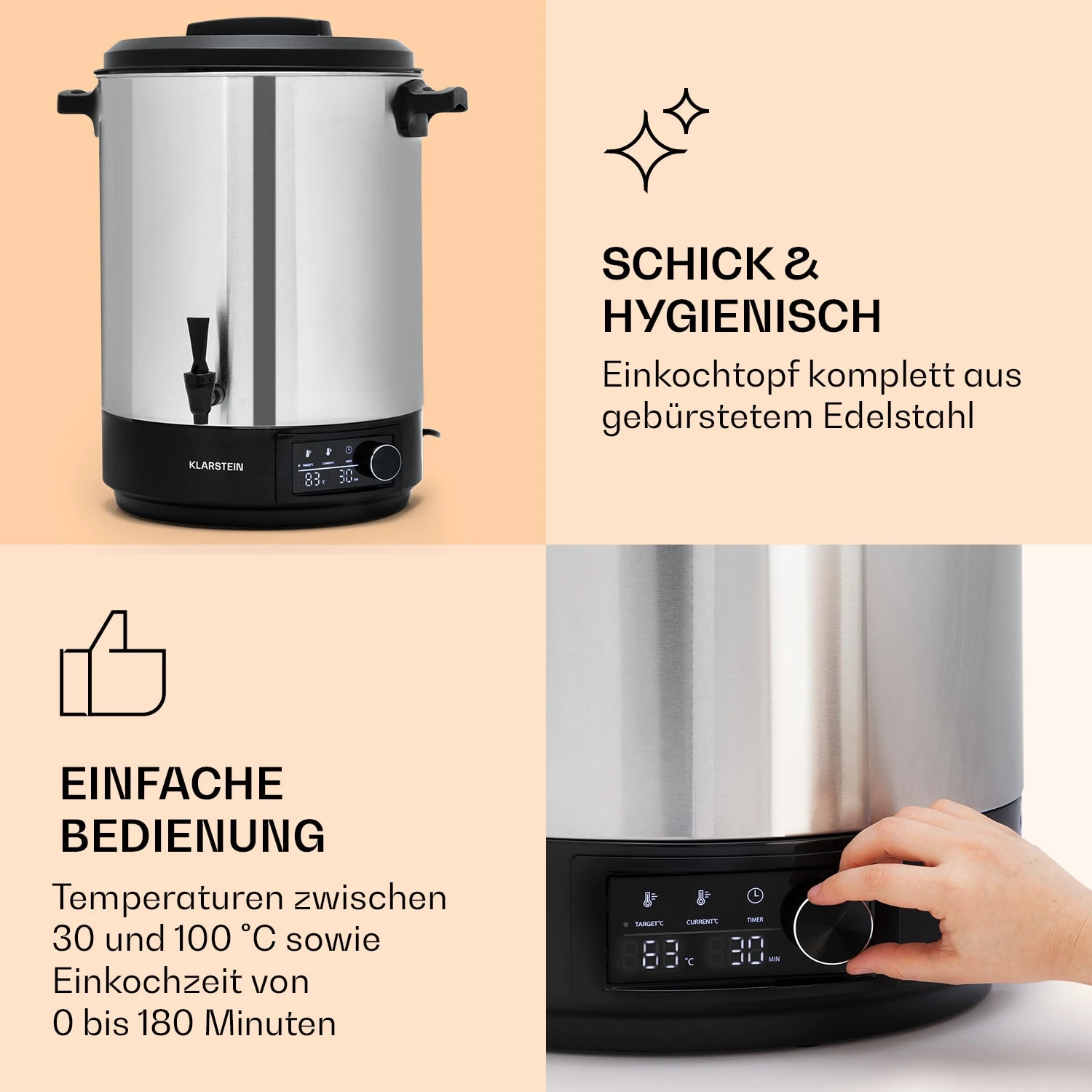 Heute wird gekocht, eingekocht! Mit dem Klarstein Abbey 40 Einkochtopf kommt Abwechslung auf den Speiseplan – mit Langzeiteffekt. Der 40 Liter große Einkocher bietet genug Platz, um den Inhalt deiner Einkochgläser mit Hitze in haltbare Konserven zu verwandeln. Egal ob die Obst- oder Gemüseernte, süße Marmeladenkreationen, herzhafte Wurstmasse oder fertig zubereitetes Gulasch, Braten und Rouladen – im Abbey 40 werden sie, dank wählbarer Temperatur von 30 – 100 °C und Einkochzeiten bis 180 Minuten, haltbar gemacht.