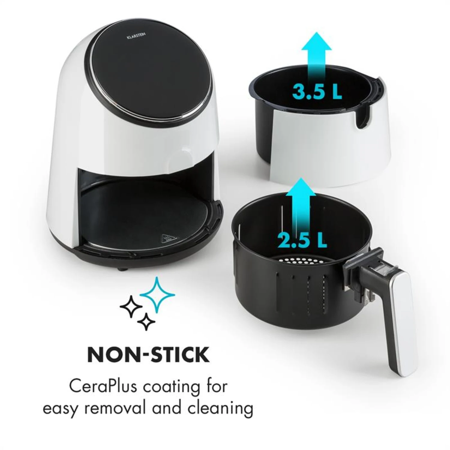 Rein mit den Pommes, fertig, los! Die Klarstein AirVital Heißluftfritteuse revolutioniert das bewährte, fettfreie Frittiersystem und bringt es auf neue Höhen des Geschmacks. Ihr 1300 Watt starkes Heißluftsystem arbeitet mit einem besonders ausgeklügelten Umluft- und Durchlüftungssystem und erreicht so die gewünschten Betriebstemperaturen in nur 3 Minuten. Per Thermostat wird die gewünschte Heizleistung in 5 °C Schritten von 80 bis 200 °C eingestellt. Dann noch den Timer minutenweise bis 60 Minuten programmieren und schön röstet die AirVital los. Wem das noch zu kompliziert ist, der kann auch einfach eines von 8 voreingestellten Programmen nutzen: Pommes, Bacon, Huhn, Lobster, Steak, Muffin, Pilze & Gemüse sowie Fisch stellen die ganze Bandbreite des Frittierens, Bratens, Grillens, Backens und Röstens zur Verfügung.