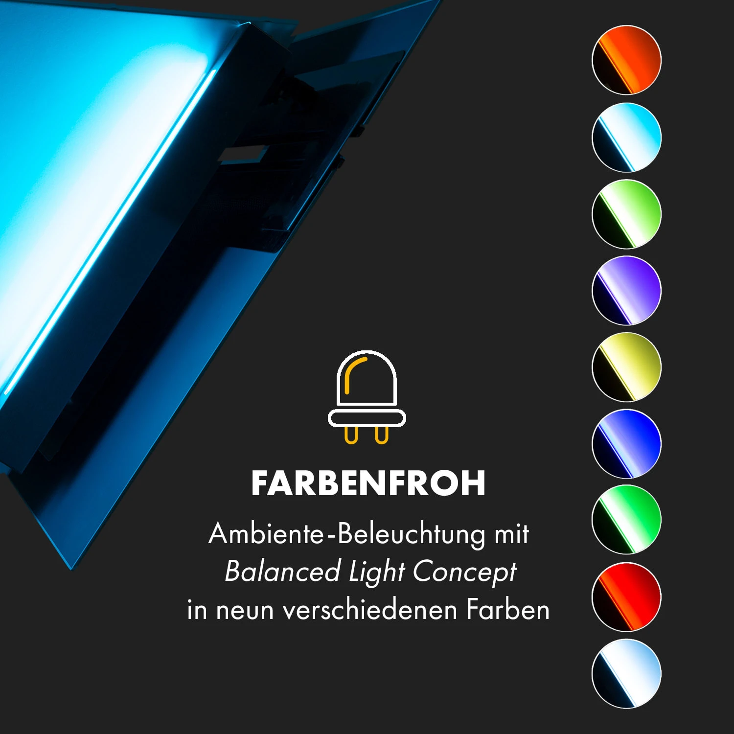 Besonderen Reiz erlangt die Klarstein Alina Kopffreihaube nicht nur durch ihr edles Äußeres, sondern auch durch ihre optional zuschaltbare Ambiente-Beleuchtung mit neun unterschiedlichen Farben. So verleiht die kopffreie Wandabzugshaube jeder Küchenzeile ihre eigene Stimmung. Zwei zuschaltbare LED-Kochflächenlampen ermöglichen zusätzlich jederzeit den ungetrübten Blick in Pfannen und Töpfe – und damit nichts, außer dem integrierten Edelstahl-Zierelement, die edle Oberfläche aus Glas durchbricht, sind sämtliche Bedienelemente als Touchpanel direkt in die Oberfläche integriert.