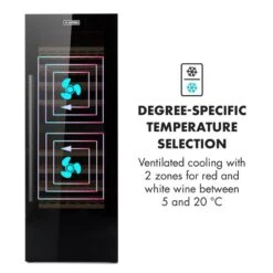 Für die volle Entfaltung seines Geschmacksaromas muss Wein auf die richtige Temperatur gekühlt werden. Mit dem Klarstein Barossa 77 Duo Weinkühlschrank ist das ganz einfach – in einem edlen Ambiente. In seiner oberen und unteren Temperaturzone beherbergt er bis zu 77 Flaschen Wein. Über ein einfaches Bedienfeld mit LCD-Anzeige wird jeweils die Temperatur für beide Kühlbereiche eingestellt. Dadurch können Weiß-, Rot- oder Rosé-Wein punktgenau gekühlt werden. Für eine gekonnte Präsentation der Weinschätze sorgt die Panorama-Fronttür aus 3-lagigem Sicherheitsglas mit ihrer schwarzen Hochglanzeinfassung. Die zuschaltbare Innenbeleuchtung setzt die gelagerten Flaschen gekonnt in Szene. Damit ist er nicht nur im heimischen Bereich, sondern auch in Bars und Restaurants ein stilvoller Blickfang.