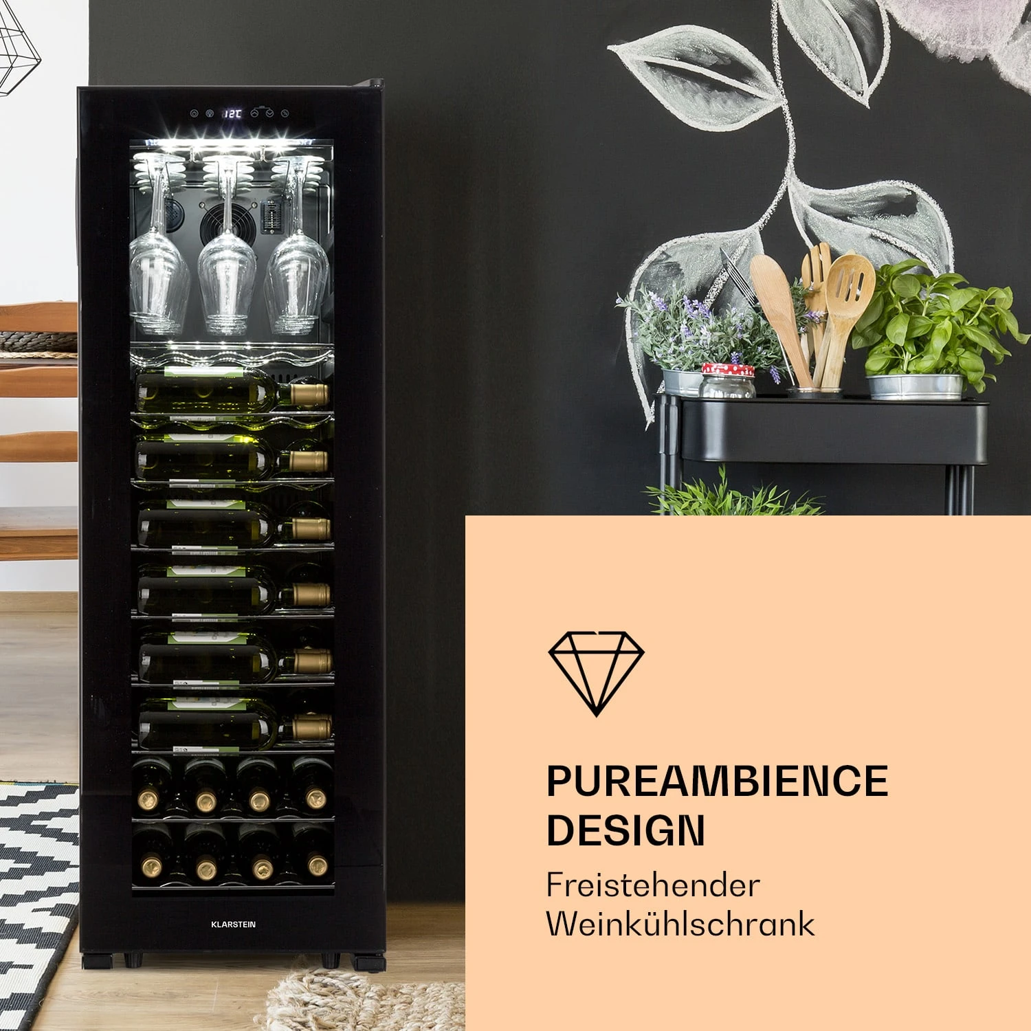 Weinlagerung der Profiliga für Liebhaber und Genießer: Der Weinkühlschrank Bellevin 62 von Klarstein bietet einen stilvollen Lagerplatz bei idealen Trinktemperaturen für Weine und Sekt in der Küche, Bars oder auf Veranstaltungen.