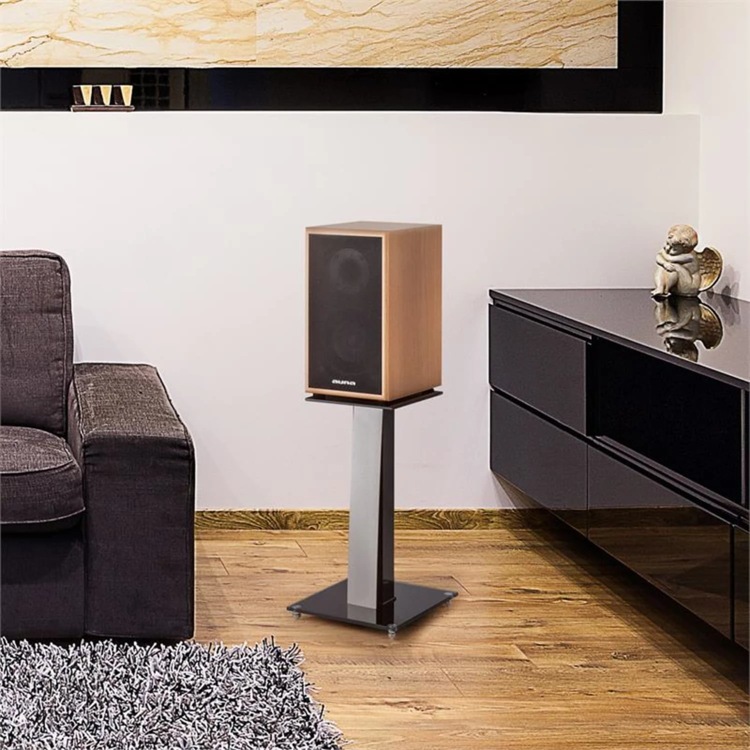 Die wertigen Materialien der auna-Boxenständer – getöntes Sicherheitsglas und eine kantige Mittelsäule aus Aluminium – vertragen sich vorzüglich mit einem modernen Einrichtungsverständnis. Zur Stärkung und Wahrung ihrer klaren, aufgeräumten Außenwirkung bieten die Boxen-Ständer die Möglichkeit zur verdeckten Kabelführung über einen integrierten Kabelkanal mit MDF-Abdeckung im Eiche-Look.