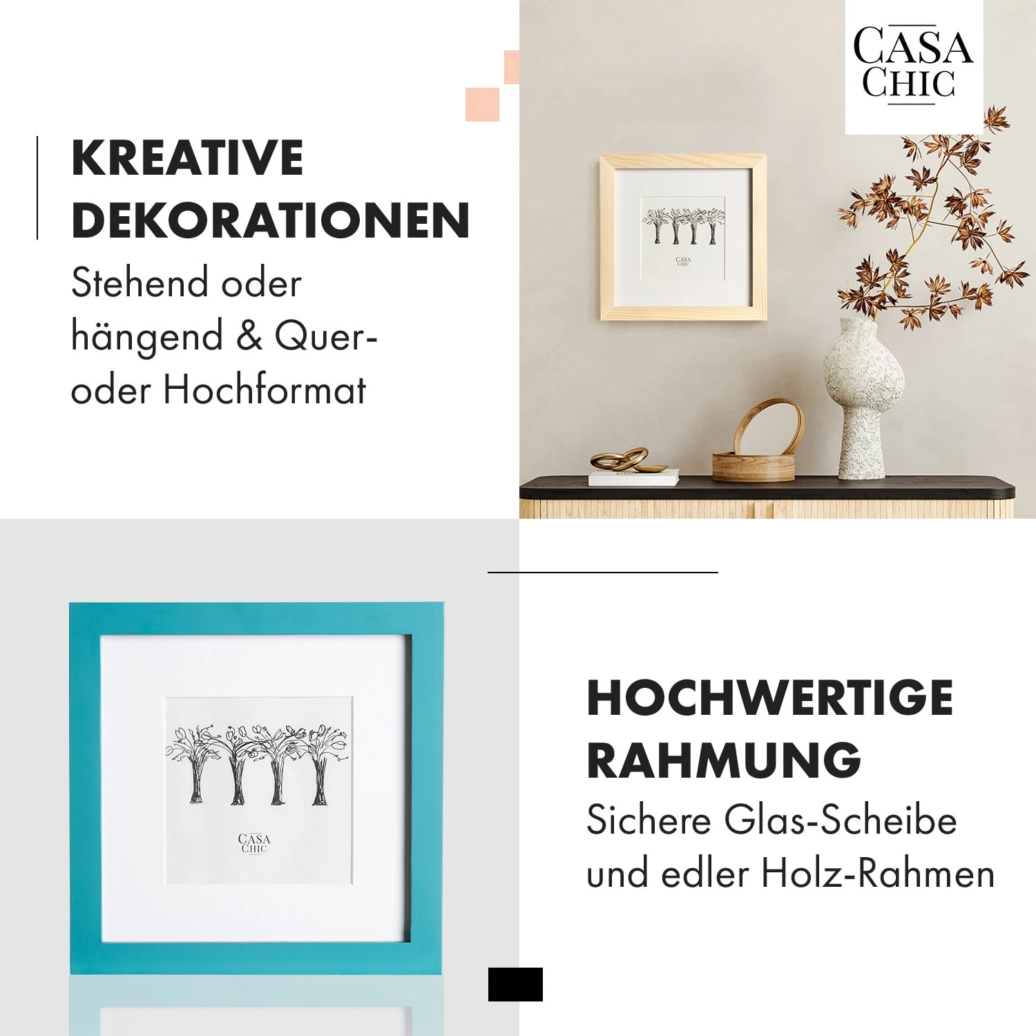 Die Casa Chic by blumfeldt Clapton Bilderrahmen bringen eine neue Eleganz in dein Zuhause. Setze deine Lieblingsfotos – mit oder ohne Passepartout – gekonnt in Szene: Als Aufsteller im quadratischen Format oder als klassischer Wandbilderrahmen. Hinter seiner Echtglasscheibe wird jedes Bild zum Hingucker. Die hochwertige Halterung auf der Rückseite gestaltet das Einlegen oder Austauschen der Bilder besonders einfach.