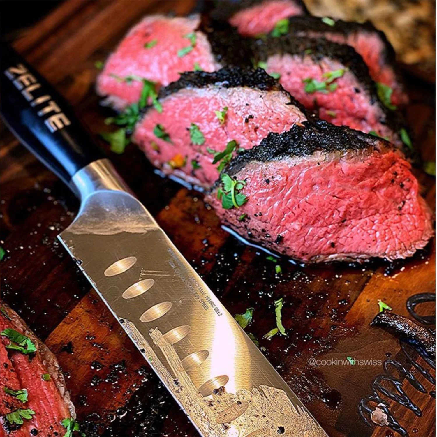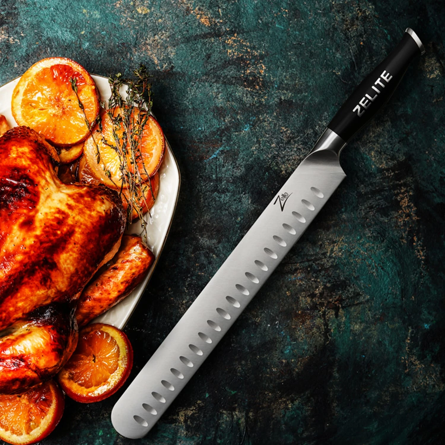Das Zelite Infinity by Klarstein Comfort Pro 12″ Aufschnittmesser macht es dir ganz einfach, in einem Schnitt selbst durch große Fleischstücke zu gleiten und so wunderbar gleichförmige Scheiben zu erhalten. Der Hohlkammerschliff hilft dabei zusätzlich, indem er ein Ankleben und Mitreißen des Schneidguts verhindert. Ergänze deine Küchenmesser oder nutze es als perfektes Geschenk für kochende Freunde.