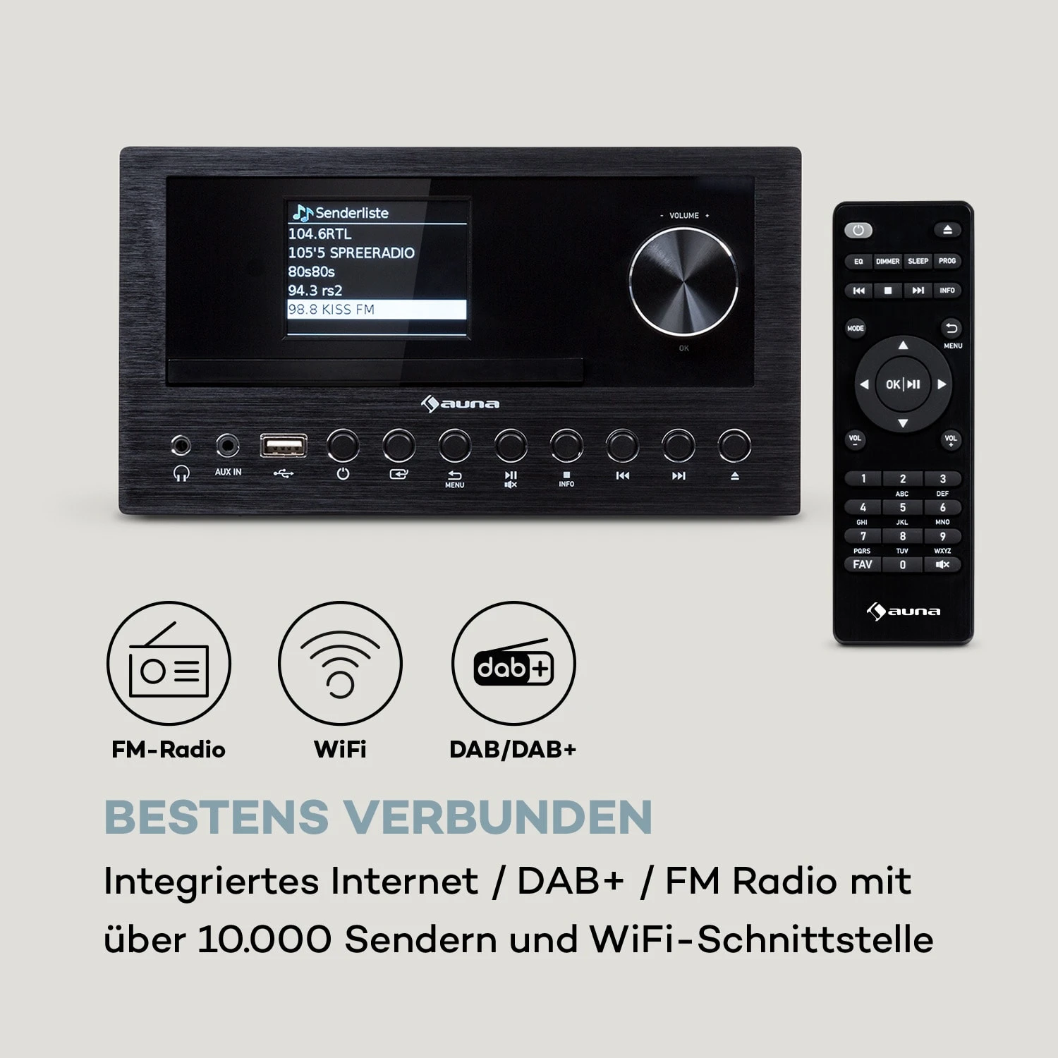 Die auna Connect System Stereoanlage mit 2 x 15 Watt RMS Lautsprechern bereichert dein Zuhause mit hochwertiger Soundqualität und spielt dank vieler Funktion immer die richtige Musik zur richtigen Zeit. Die Anlage mit integriertem Internet / DAB+ / FM Radio empfängt bis zu 10.000 Sender und verfügt über integriertes WiFi, einen klassischen CD-Player, einen USB-Anschluss zur MP3-Wiedergabe sowie einen AUX-Eingang. Besonders hervorzuheben ist die drahtlose Bluetooth-Funktion mit einer Spotify Connect-Erweiterung, durch die das Connect System zuverlässiges Audio-Streaming per Smartphone, Tablet oder Laptop gewährleistet. Die Multiroom-Funktion bietet dir darüber hinaus die Möglichkeit, das Gerät als Teil einer Multiroom Gerätegruppe zu konfigurieren, die über dasselbe WiFi-Netzwerk kontrolliert werden kann.