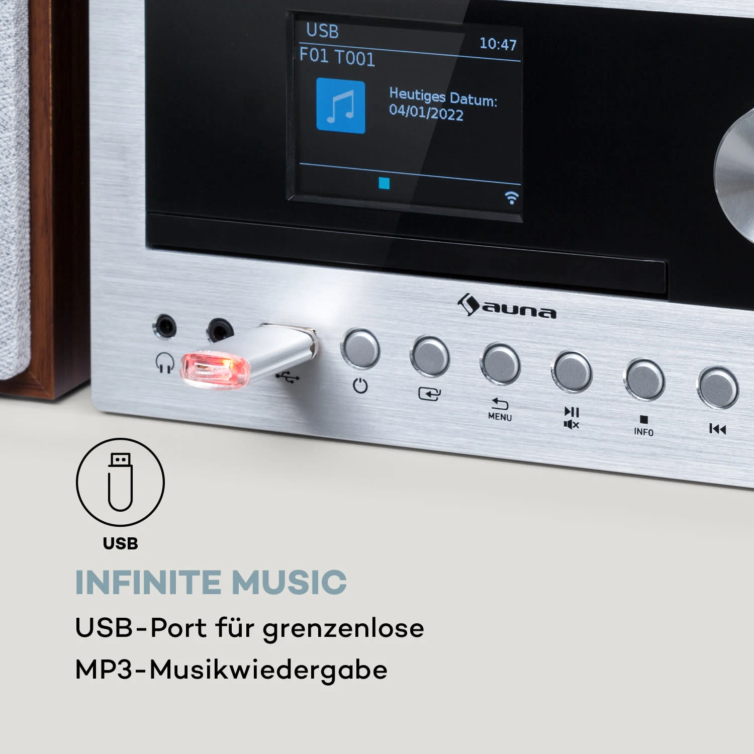 - USB-Anschluss für MP3-Wiedergabe
