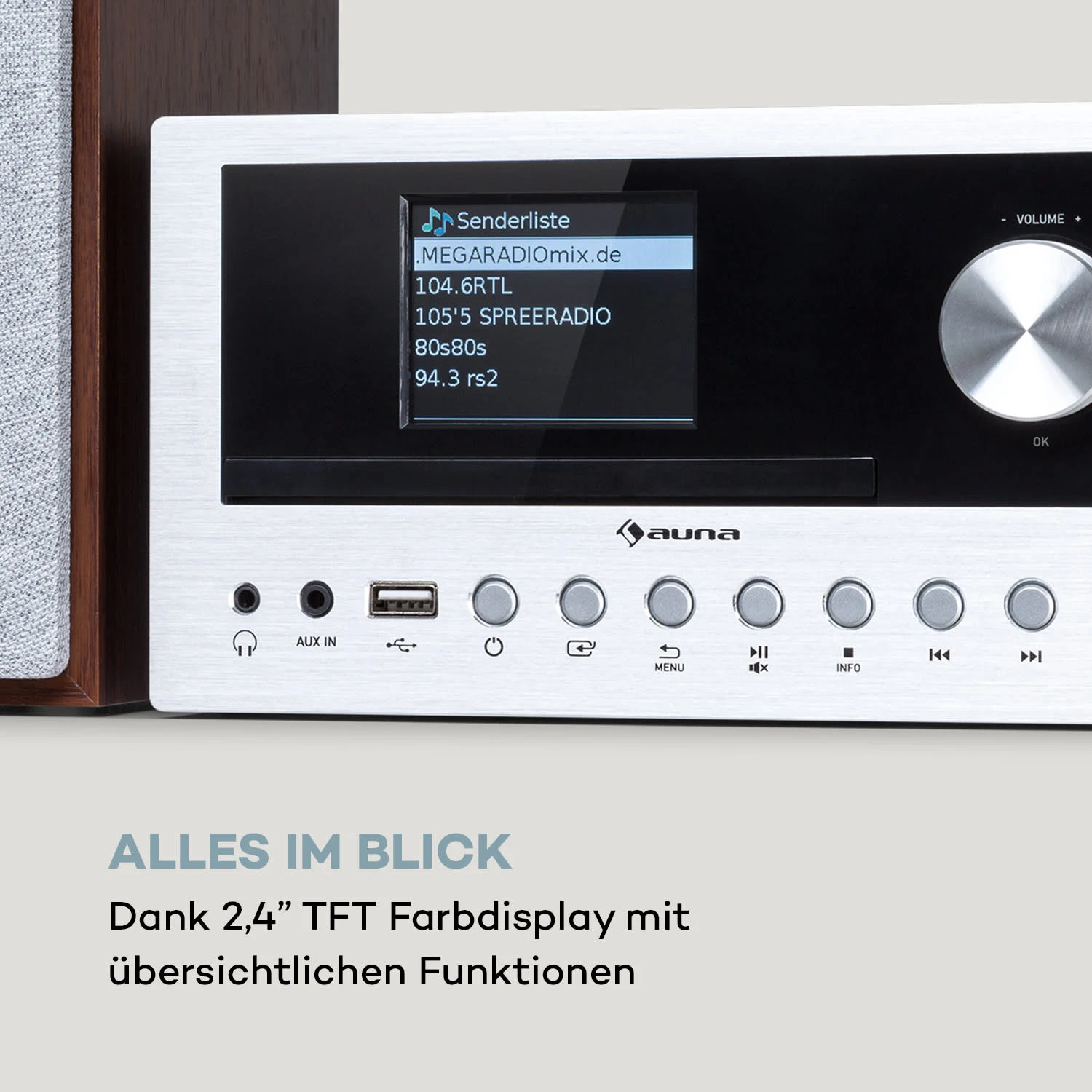 Zur einfachen Steuerung genügt der Download der UNDOK-App sowie eine Fernbedienung, über die du die Stereoanlage bequem aus der Ferne bedienen kannst. Das übersichtliche 2,4″ TFT Farbdisplay mit Hintergrundbeleuchtung hält dich durch die Anzeige der aktuellen Musikwiedergabe zu jeder Tages- und Nachtzeit zuverlässig auf dem Laufenden.