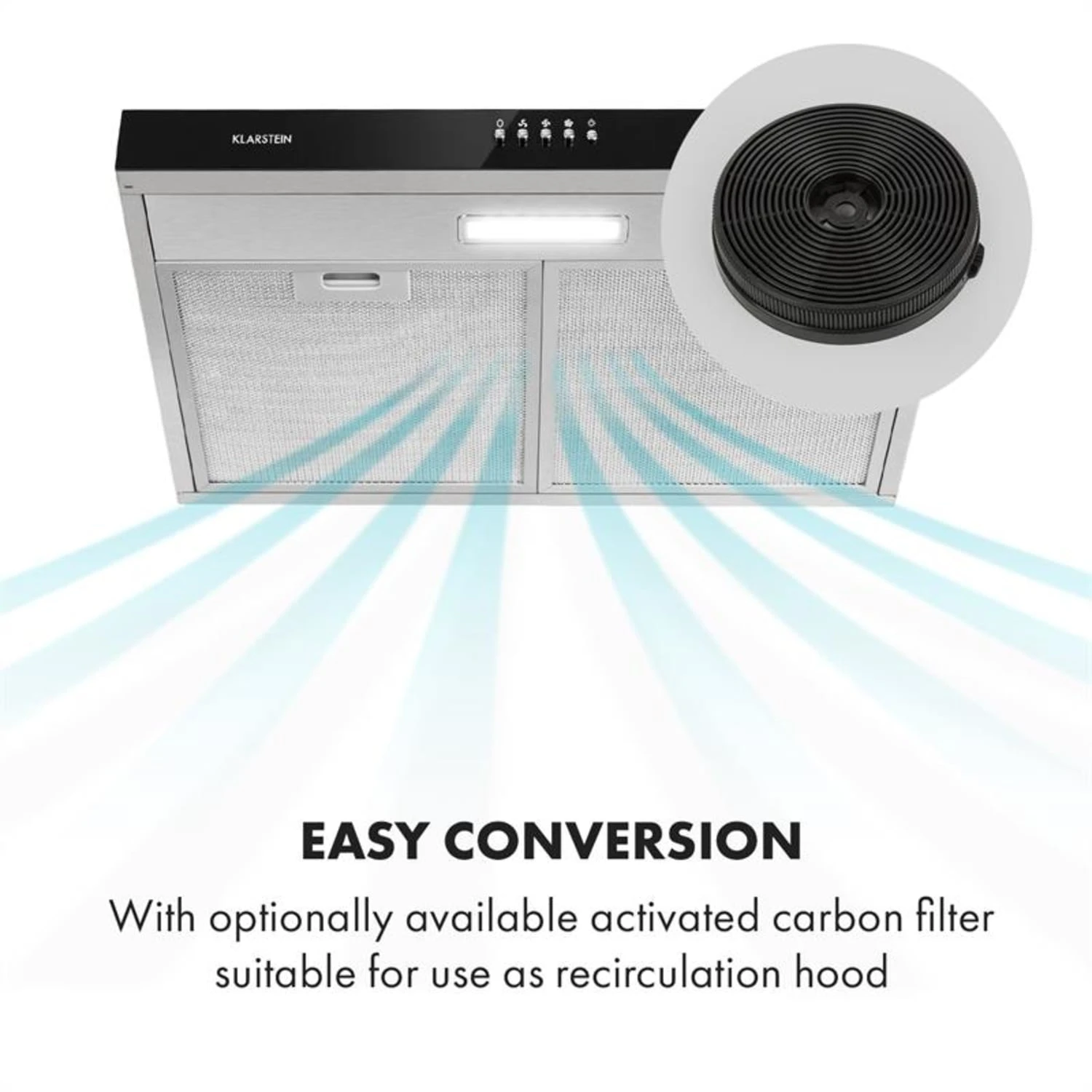 Die Abzugshaube ist zur Umrüstung auf Umluftbetrieb geeignet. Dafür wird ein zusätzlicher Aktivkohlefilter benötigt, den Sie unter Artikelnummer 10033473 erhalten.