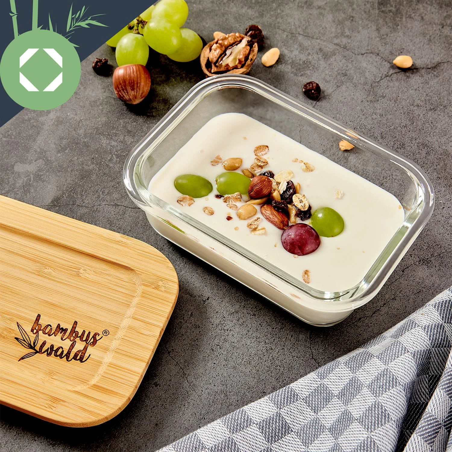Edle Allrounder im Set: 4 Frischhaltedosen in verschiedenen Größen. Ob zum Aufbewahren von Speisen, Käse oder Wurst im Kühlschrank, von Vorräten im Regal oder auch fürs Verpacken der Pausenbrote – die Verwendungsmöglichkeiten des Sets sind fast unbegrenzt. Durch das robuste Borosilikatglas eignen sich die Vorratsdosen sogar zum Aufwärmen oder Einfrieren von Speisen. Dank dem dichten Bambusdeckel mit Silikonabdichtung bleibt alles fest verschlossen und behält lange sein Aroma. Praktisch, nachhaltig, edel: aufeinander gestapelt wird das Set zum Hingucker in deinem Küchenregal.