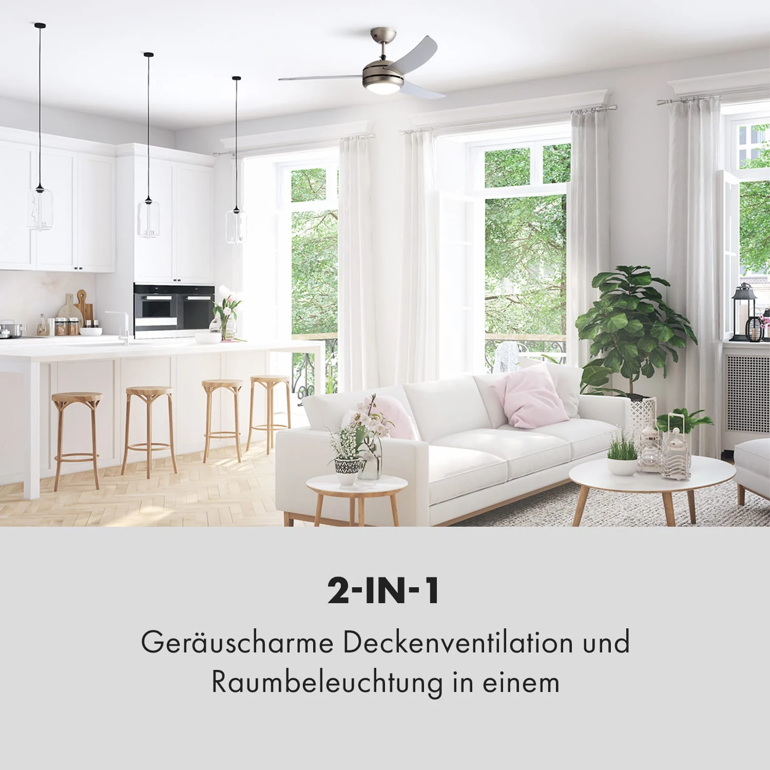 Erfrischung, Wärmezirkulation und Deckenbeleuchtung in einem: Der Klarstein El Paso 2-in-1 Deckenventilator überzeugt mit vielen Funktionen und bequemer Fernsteuerung.