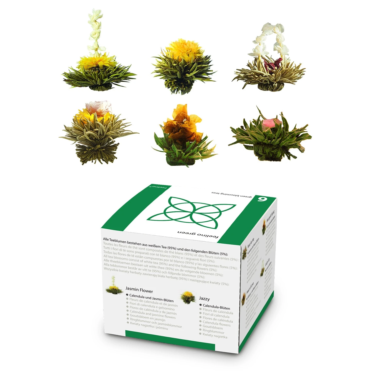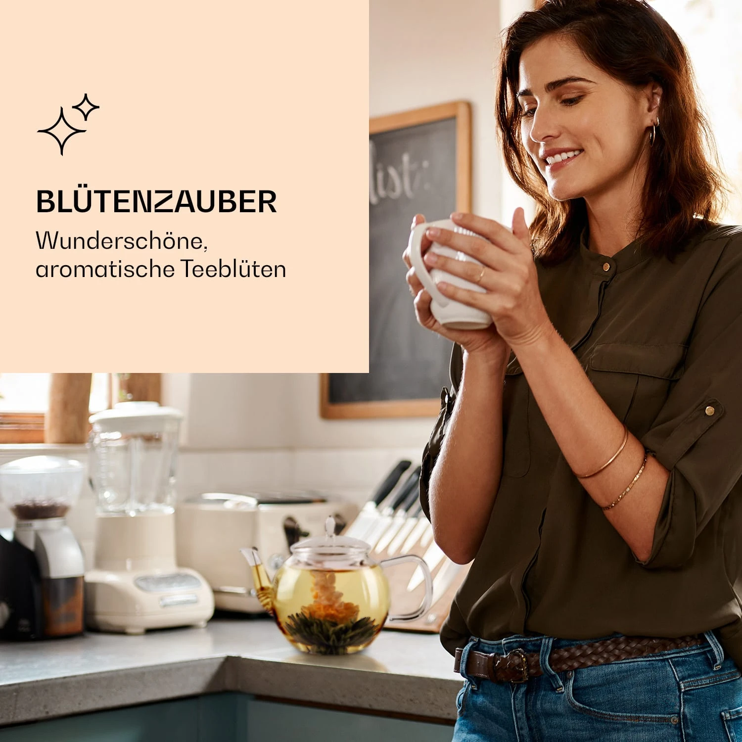 - besonderer Aufguss: exotische Teeblüten öffnen sich langsam und farbenprächtig in heißem Wasser
