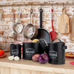 Die Georgia Vintage-Vorratsbehälter verleihen deiner Küche das gewisse Etwas und sind eine Bereicherung für jeden Haushalt: Bestehend aus insgesamt 3 x Klarstein Vorratsdosen für Knoblauch (12 x 18 cm (ØxH)), Zwiebeln (17 x 22,5 x 14 cm (BxHxT)) und Kartoffeln (27 x 21 x 23,5 cm (BxHxT)).