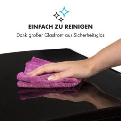 Das Heizgerät mit einer maximalen Leistung von 1500 Watt kann über einen Drehknopf bequem reguliert werden und verströmt Wärme auf den Heizstufen von 600, 900 und 1500 Watt. Ein selbsregelnder Thermostat sowie eine integrierte Temperatursicherung sorgen zuverlässig für eine gleichbleibende Raumtemperatur und einen energiesparenden Verbrauch. Eine Kontrolleuchte gibt zudem jederzeit Auskunft über die bestehenden Einstellungen. Dank seiner großen Glasfront aus Sicherheitsglas ist das Gerät besonders schnell und einfach zu reinigen.