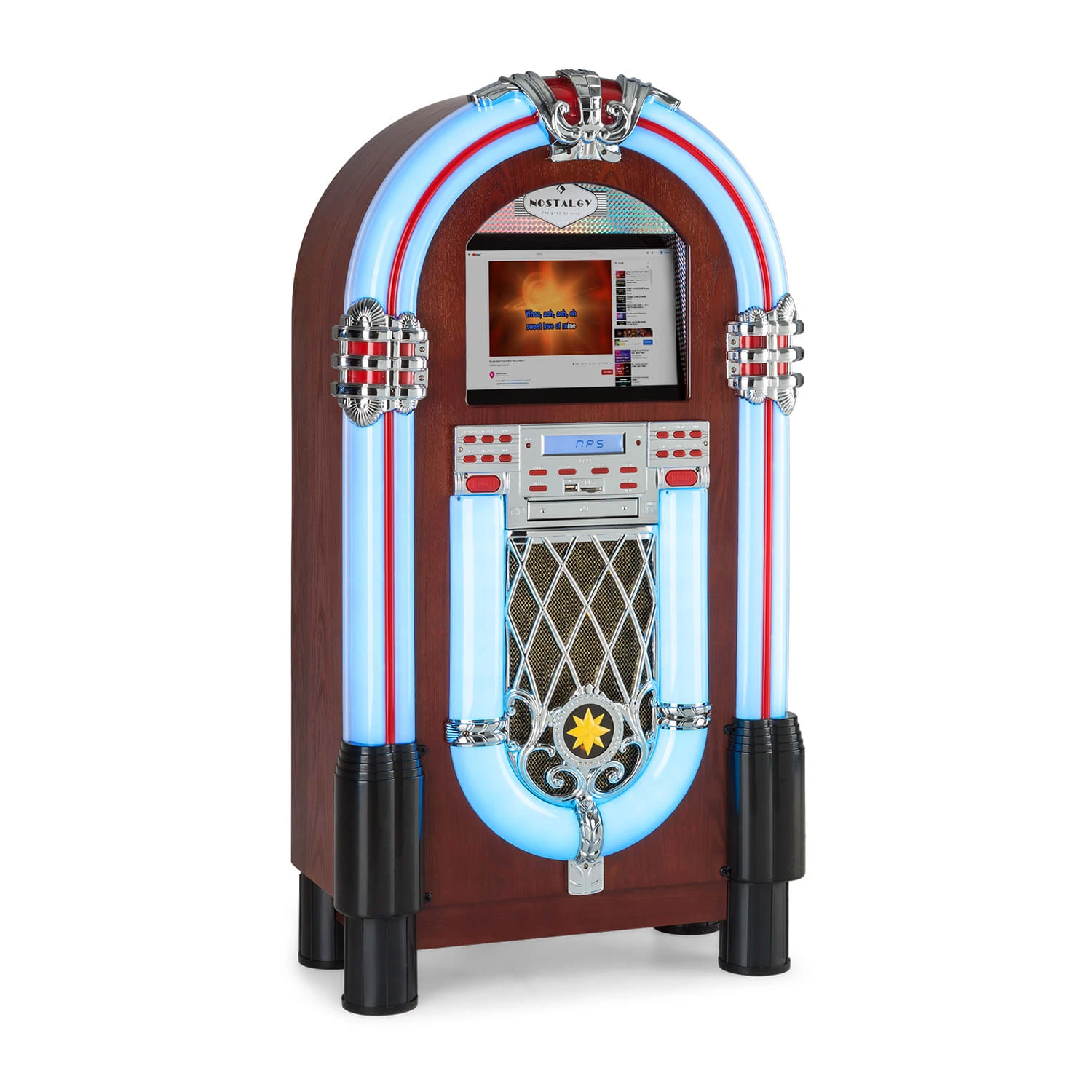 Nostalgisches Design trifft neueste Technik: die Graceland Touch Jukebox von auna überzeugt mit großem Touch-Bedienfeld, zahlreichen Wiedergabemöglichkeiten und einem unverwechselbaren Äußeren.