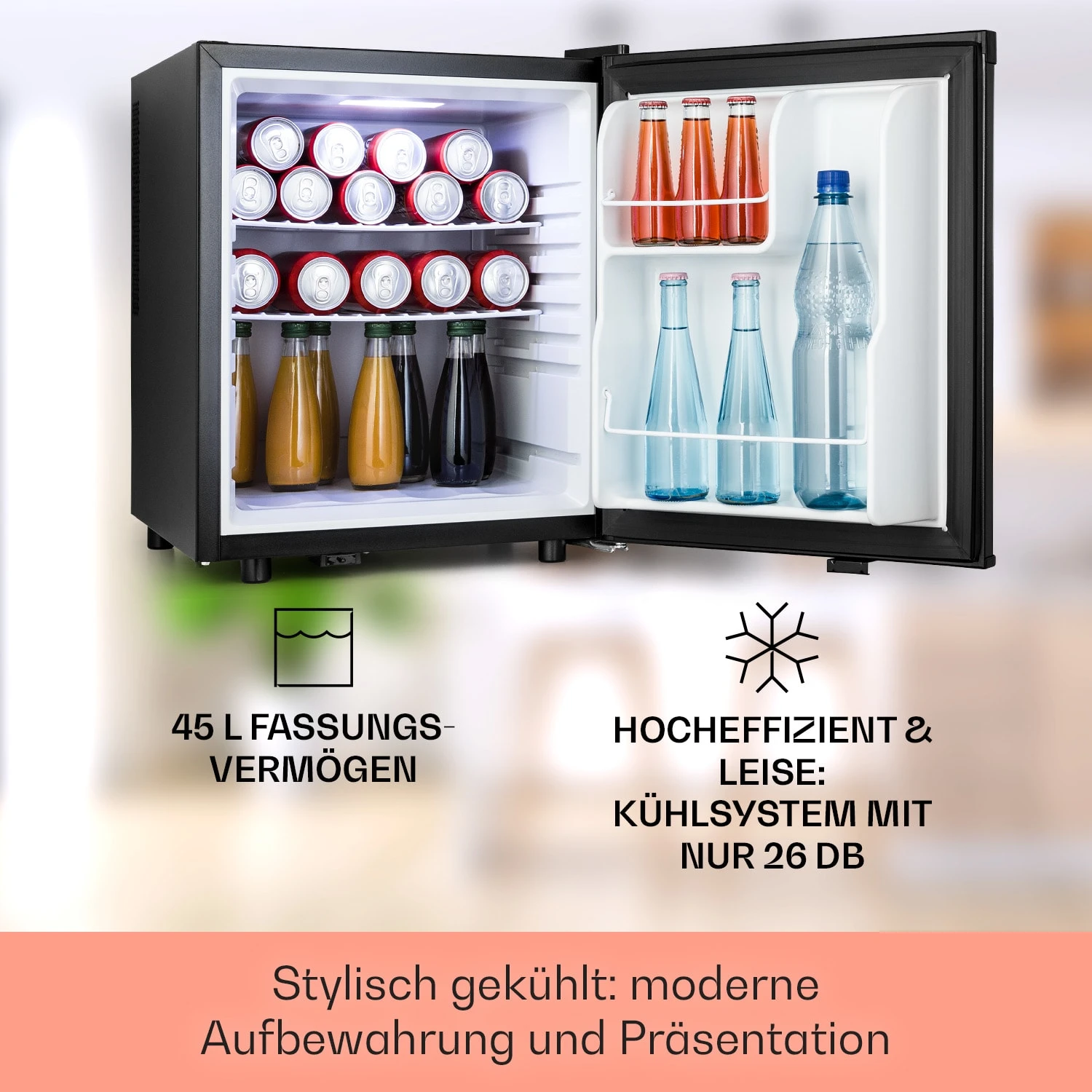 Immer bestens gekühlt: Der Happy Hour 45 Kühlschrank von Klarstein ist ein designstarkes Platzwunder für eine ideale Lebensmittelaufbewahrung.