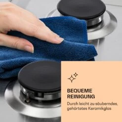 Nach dem Kochen kannst du das Gaskochfeld bei Bedarf ganz einfach reinigen: Zu diesem Zweck besitzt es eine Beschichtung aus leicht zu säuberndem, gehärtetem Keramikglas. Das sieht nicht nur unglaublich gut aus, es ist auch wunderbar pflegeleicht.