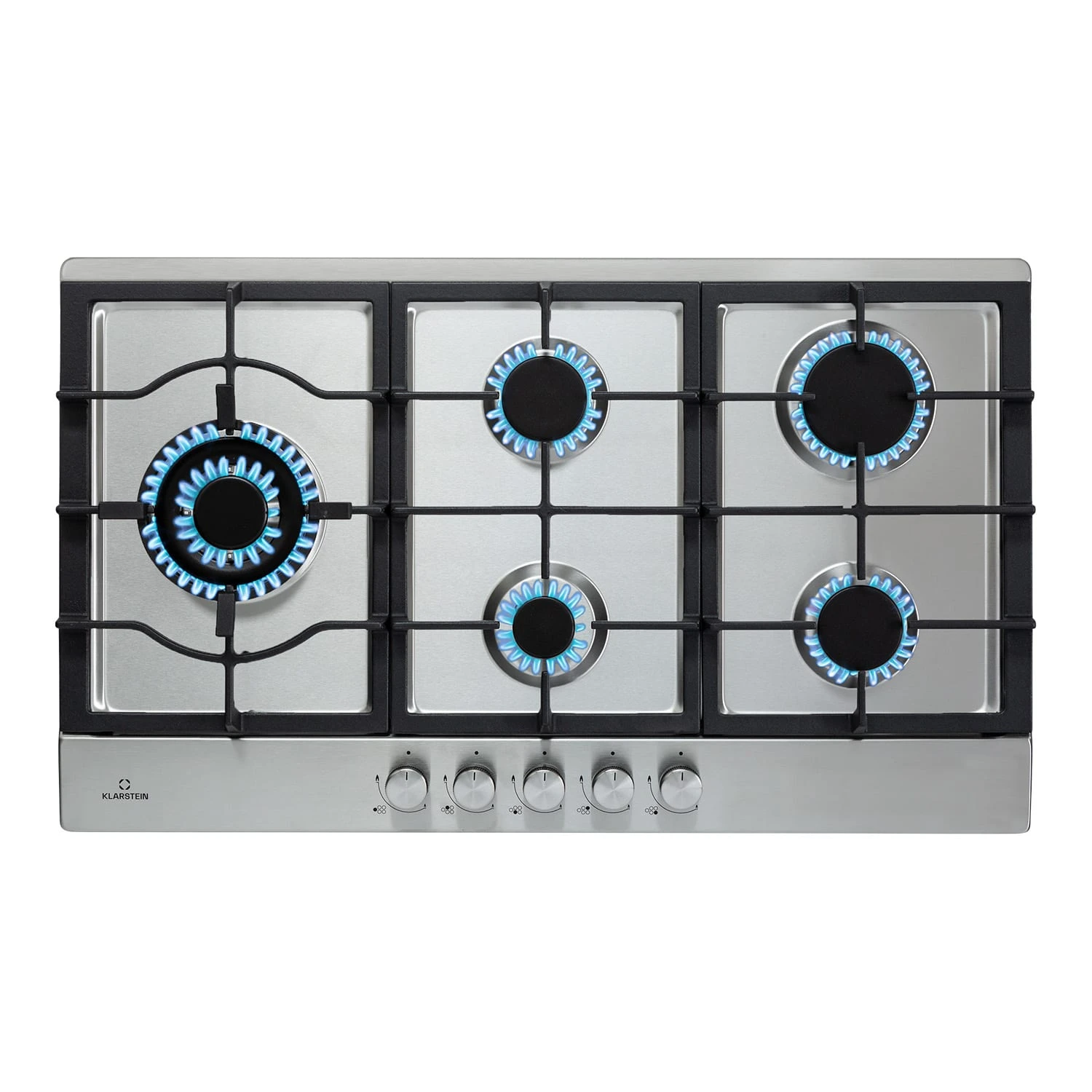 5 Flammen für maximale Vielfalt beim Kochen: Auf dem geräumigen Ignito Chef Edition 5 Zonen Gaskochfeld von Klarstein befinden sich fünf hochwertige Sabaf-Brenner, die mit einer Leistung von jeweils einmal 3,6 kW, 3,0 kW und 1 kW sowie zweimal 1,75 kW ordentlich einheizen. Durch die unterschiedlichen Brenner-Größen ist das Kochfeld für vielfältige Mahlzeiten geeignet. Die Bedienung ist dabei dank der selbsterklärenden Symbole an den großen Drehknöpfen absolut intuitiv: du kannst die Hitzezufuhr während des Kochvorgangs immer wieder direkt anpassen und die Gasflammen werden, ohne zusätzliches Feuer, bequem per SnapJetIgnition-System entfacht. Die Brenner verteilen die Hitze von der Mitte bis zu den Rändern deiner Töpfe oder Pfannen, so wird alles gleichmäßig gegart. Die drei abnehmbaren Kreuze aus massivem Gusseisen sind für beinahe alle Arten von Kochgeschirr geeignet und sitzen passgenau und kippsicher über den Flammen. Der zusätzliche Aufsatzring leistet beim Kochen mit einem Wok hervorragende Arbeit.