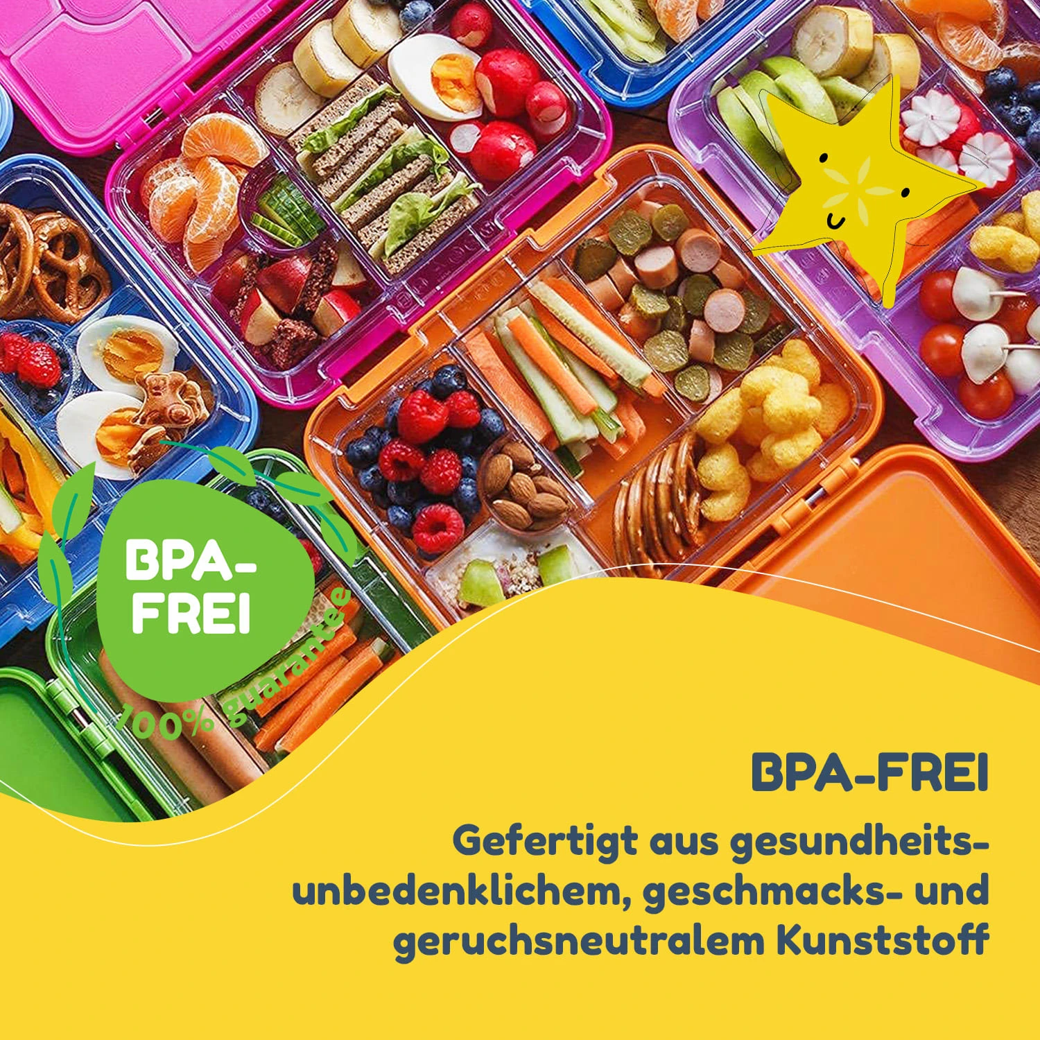 Praktisch und vielfältig im Kinderalltag, komfortabel am Abend: Durch die raffinierte Stecktechnik mit den herausnehmbaren Fächern lässt sich diese Lunchbox optimal reinigen. Eine gesunde Hygiene ist gewiss, denn die inneren Fächer können problemlos in die Spülmaschine gegeben werden. Da die äußere Box mit den Lebensmitteln nicht in Berührung kommt, kann sie einfach mit einem feuchten Tuch abgewischt werden. Durch die ideale Abdichtung kannst du die Vesperbox auch schon am Vorabend mit köstlichen Snacks befüllen. Alle Teile der Box sind aus BPA-freiem Kunststoff und damit nicht nur geschmacks- und geruchsecht, sondern auch völlig unbedenklich für die Gesundheit.