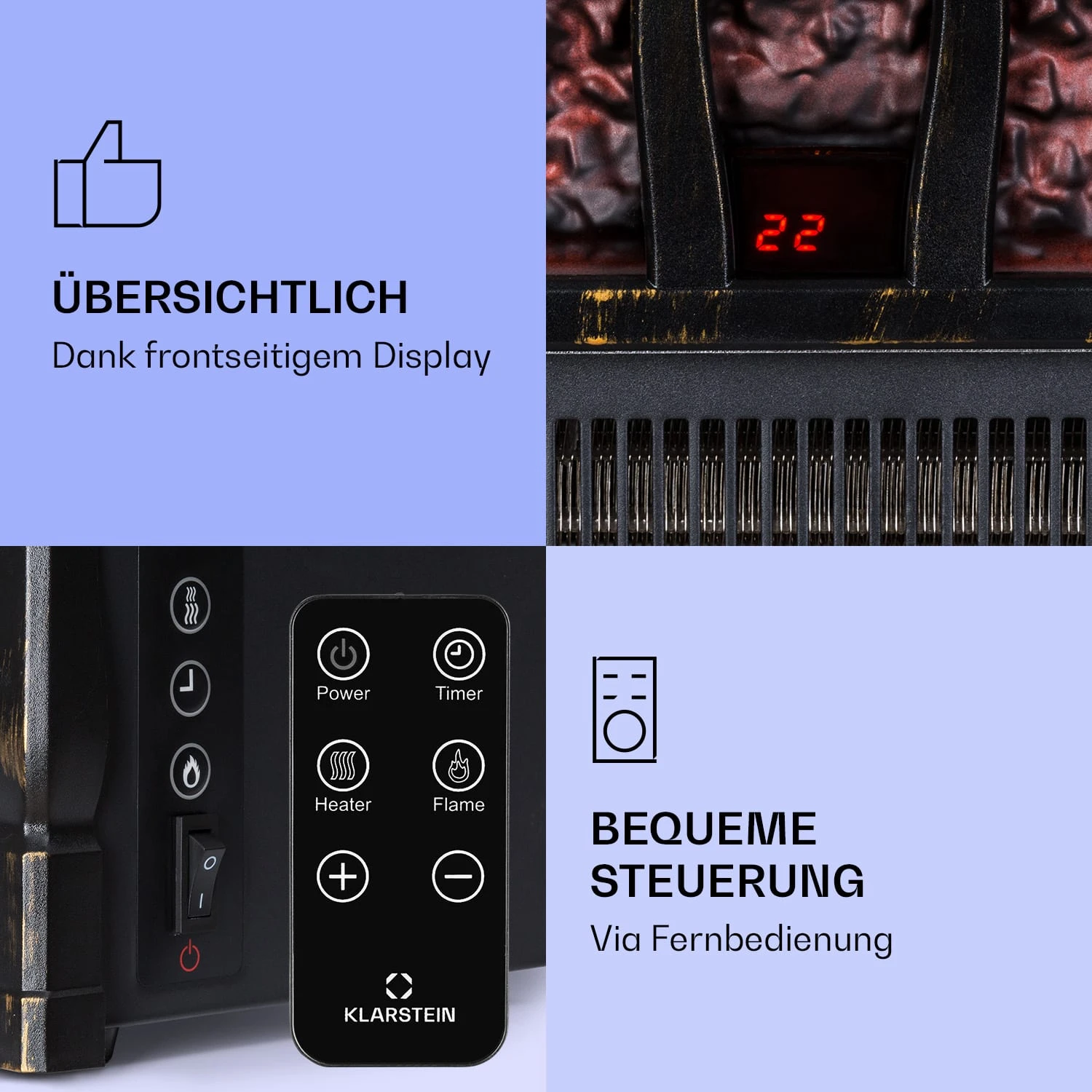 Mit dem Klarstein Kamini FXL 2G Elektrokamin kannst du das ganze Jahr hindurch eine gemütliche Kaminatmosphäre mit glimmenden Holzscheiten und einer realistischen 3D-LED-Flammenillusion genießen. Die zuschaltbare zweistufige Heizfunktion macht die Illusion perfekt. Gesteuert wird der Kamini FXL 2G via Touch-Bedienfeld oder ganz bequem vom Sofa über die praktische Fernbedienung. Fünf Helligkeitsstufen und eine Timerfunktion machen den Klarstein Kamini FXL Kamineinsatz zum idealen Ganz-Jahres-Kamin.