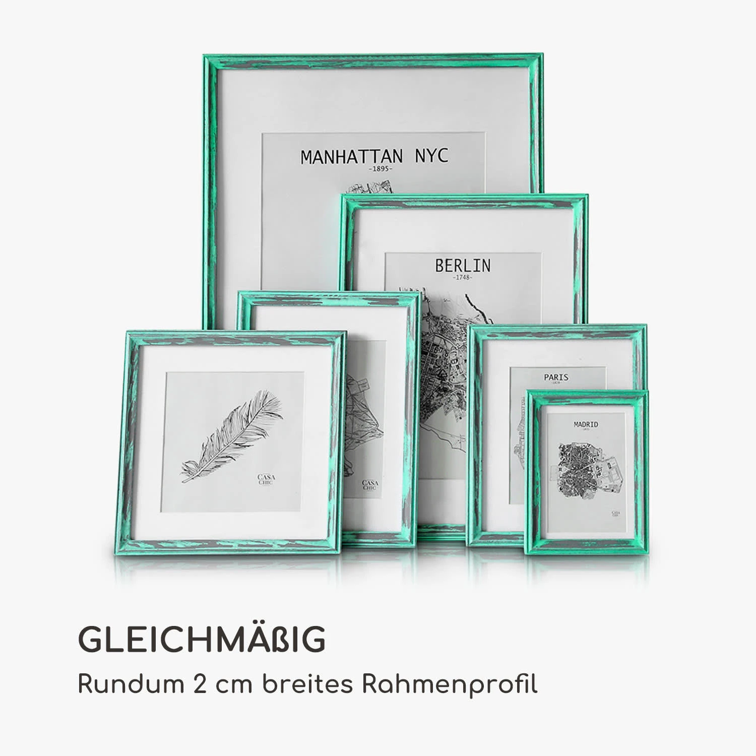 Jeder Rahmen ist ein Unikat: Die Lancaster Bilderrahmen von Casa Chic by blumfeldt aus edlem Pinienholz im Shabby-Chic-Look sind handgearbeitet und bringt deine Fotos und Bilder sowohl im Hoch- als auch im Querformat ideal zur Geltung. Bleibe flexibel und gestalte wunderschöne Wandcollagen oder arrangiere deine Lieblingsfotos auf dem Sideboard oder im Regal. Das mitgelieferte Passepartout überlässt dir die Wahl des passenden Bildausschnitts. Das gleichmäßig breite Rahmenprofil und die Frontscheibe aus Echtglas sorgen für Eleganz und besten Schutz.