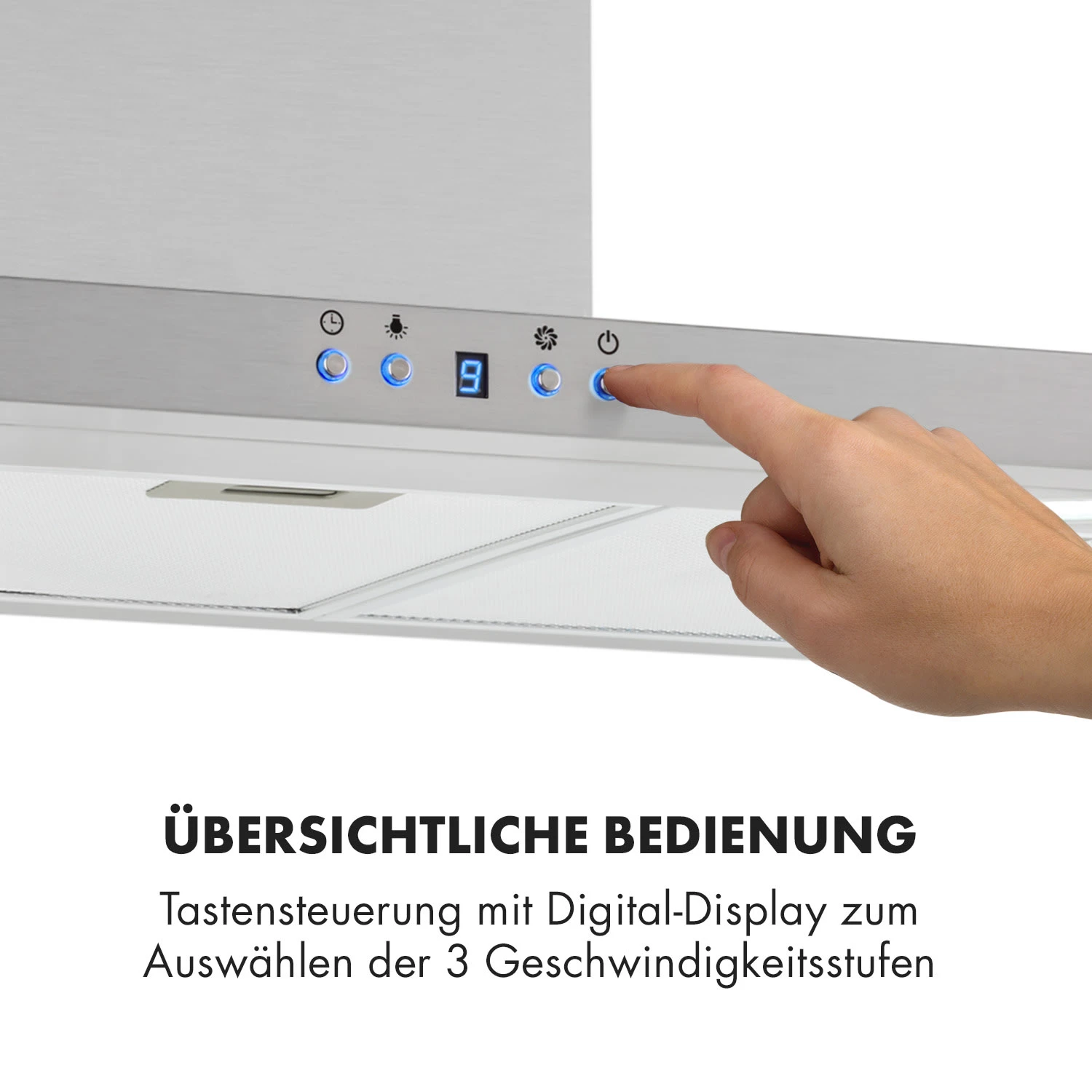 Mit 90 cm Breite ist die Klarstein Limelight Dunstabzugshaube für kleine bis mittelgroße Kochflächen und Küchenzeilen bestens geeignet. Die höchste Leistungsstufe befördert pro Stunde bis zu 600 Kubikmeter Abluft aus der Küche und wird so auch mit der Zubereitung mehrerer Gänge fertig. Dank moderner Technik schont sie durch reduzierten Stromverbrauch den Geldbeutel und die Umwelt. Die einfache Bediensektion an der Frontseite ermöglicht die Wahl der drei Ventilationsstufen. Ein Abschalttimer lässt die Haube nach dem Kochen nachlüften und schaltet sie dann selbstständig ab. Zwei integrierte Leuchten sorgen für viel Licht auf Kochfläche, sodass passionierte Köche genau sehen, was sie gerade tun.