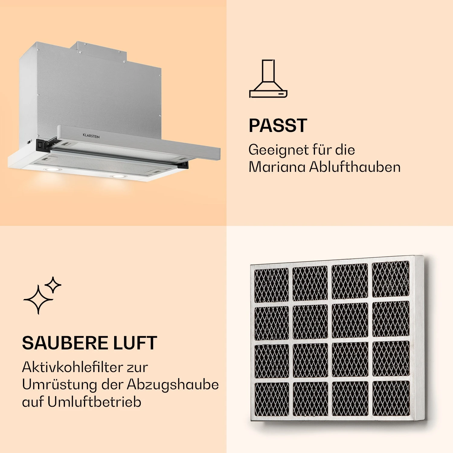 Neue Kraft für frische Luft in der Küche. Der Klarstein Mariana Aktivkohlefilter versorgt deine Dunstabzugshaube mit einem Zubehör zur Luftverbesserung, das ganz einfach in der Haube eingesetzt wird. Die Aktivkohle im Filter bindet Gerüche und macht deine Haube fit für den Umluftbetrieb. Aktivkohlefilter sollten, je nach Häufigkeit der Nutzung der Abzugshaube, alle 3-4 Monate gewechselt werden, um ihre Leistungskraft zu erhalten.