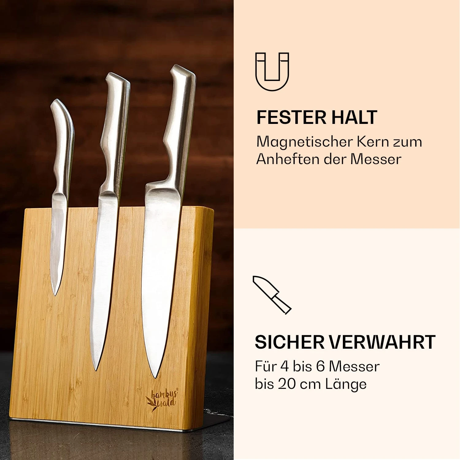 Sicher, praktisch, nachhaltig. An Klarsteins magnetischem Messerblock sind deine Messer und Küchenutensilien bestens aufbewahrt. Der Block aus Bambus mit Magnetkern erlaubt das Aufbewahren von 4 bis 6 Messern, Scheren, Schlüsseln und ähnlichem bis 20 cm Länge. Dabei kannst du die Messer ganz nach Belieben an die magnetische Front des Blocks heften. Ästhetisch ansprechend und nachhaltig präsentiert sich der Block in einer Kombination aus stabilem Bambus und rutschfestem Edelstahl-Standfuß.