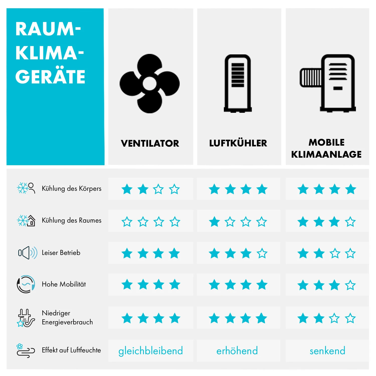 - 4 Betriebsmodi (Kühlung, Luftentfeuchtung, Ventilation und Automatik)