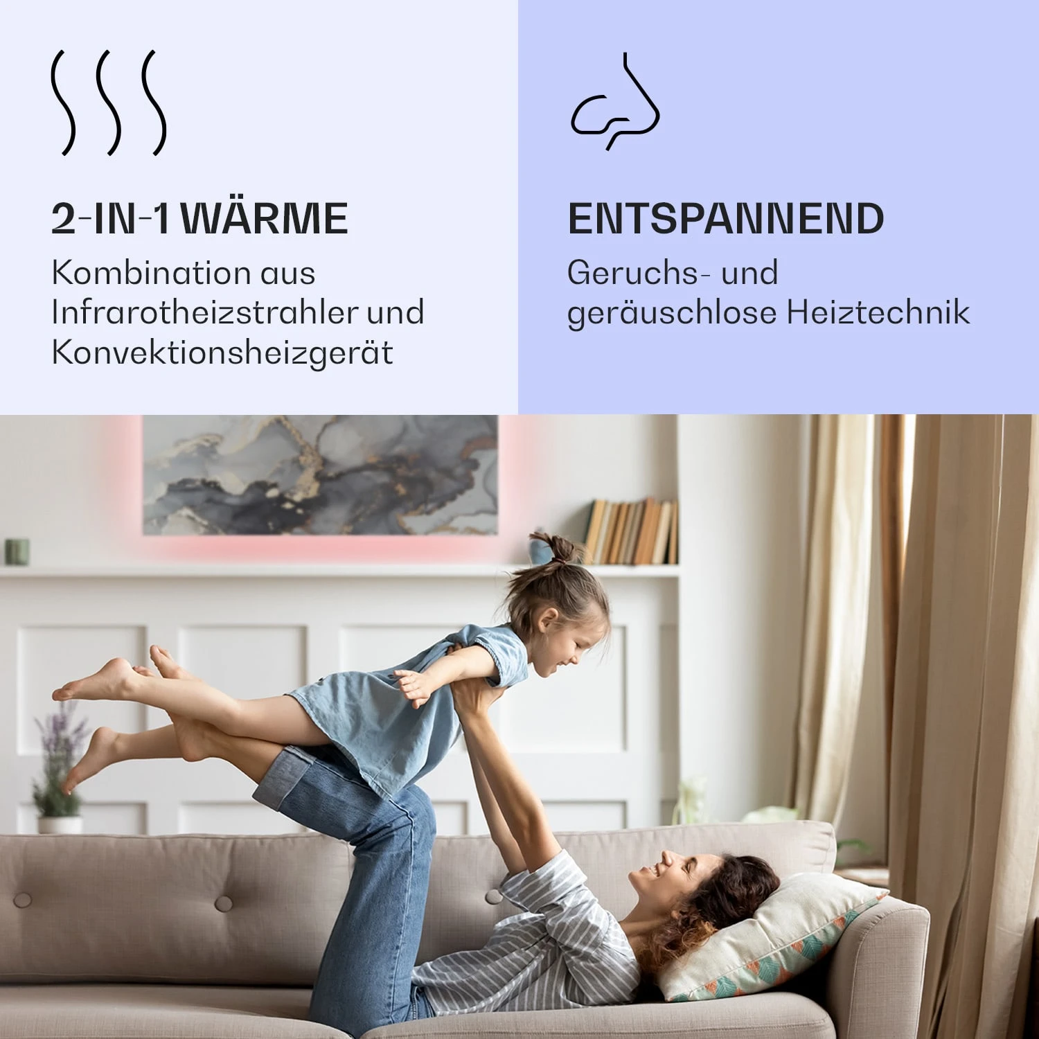 Doppelte Leistung bei gleicher Größe, die Klarstein Mojave 2-in-1 Heizgeräte vereinen geschickt einen Infrarotheizstrahler mit einem Konvektor und schaffen so in platzsparender Bauweise nicht nur schnell fühlbare Infrarot-Wärme, sondern erzeugen auch kuschlig warme Raumluft über rückseitig aufsteigende Wärme. Dabei hast du, passend zur Größe deines Raums, die Wahl zwischen einem 500, 750 oder 1000 Watt starken Heizgerät. Das gradweise einstellbare Thermostat und der Wochentimer werden dabei ganz smart via Klarstein-App oder per Fernbedienung gesteuert. Dank IP44 Sicherung sind die Konvektoren auch bestens fürs Bad geeignet. Ganz egal wo du dein neues Klarstein Mojave Smart Heizpanel aufhängst, mit seinem farbigen RGB-Ambientelicht erzeugt es überall die passende Atmosphäre.