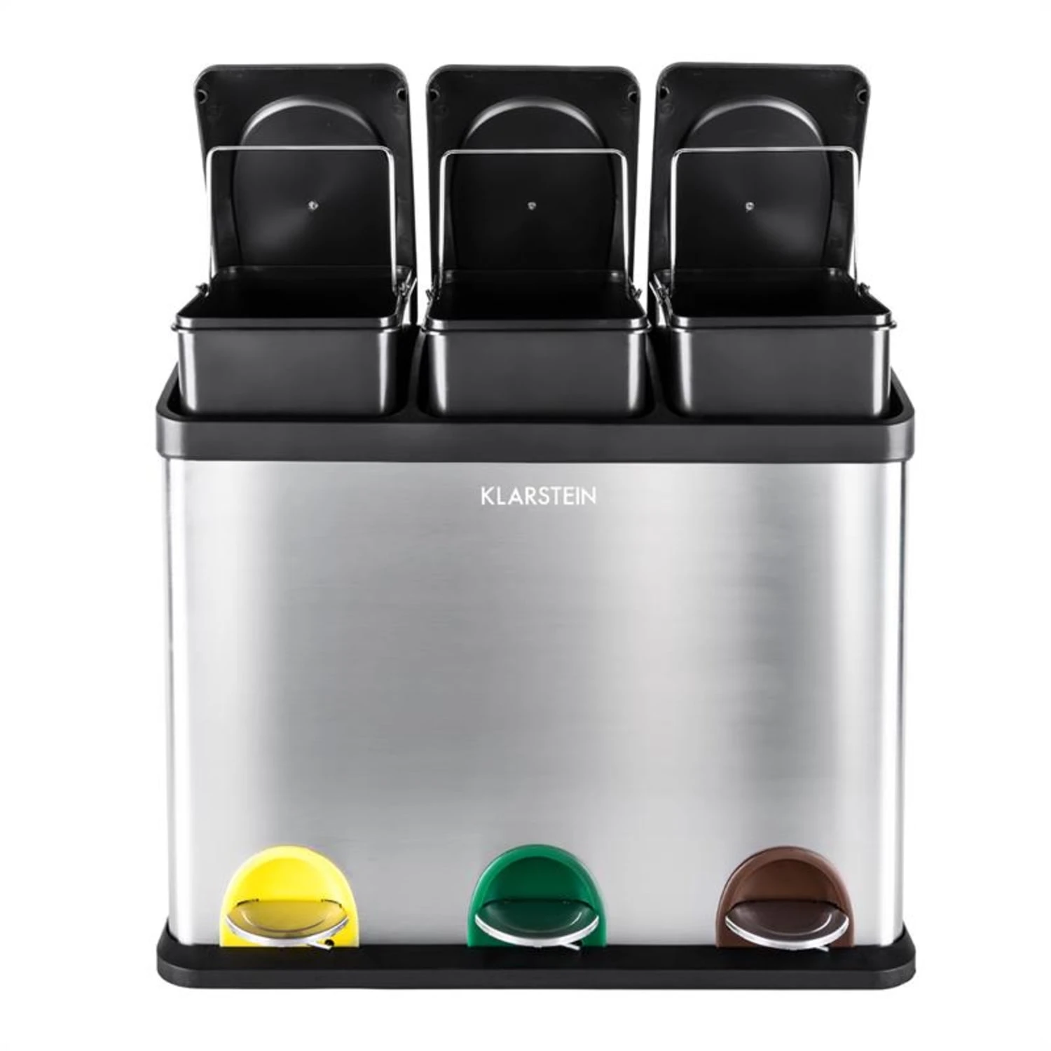 Das Gehäuse des Mülleimers besteht aus rostfreiem Edelstahl und verfügt über einen bodenschonenden Kunststoffsockel. Drei herausnehmbare Kunststoffeimer mit jeweils 15 Liter Volumen, bieten Platz für Restabfall, Biomüll und den gelben Sack. Die Einsätze können mittels praktischem Tragehenkel, schnell und separat voneinander entleert werden.