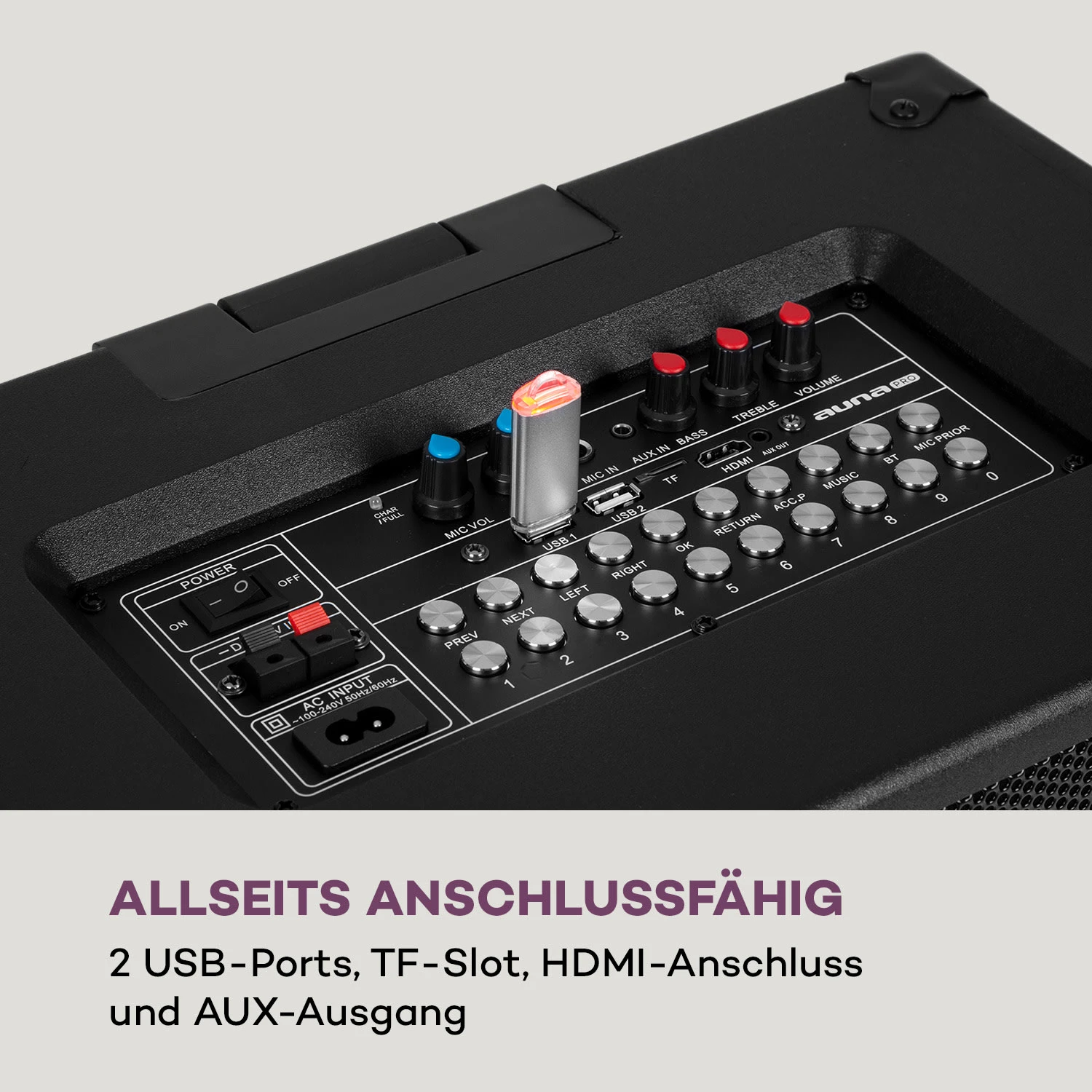 - Anschlüsse: 2 x USB-Port, 1 x TF-Slot, 1 x 6,3 mm MIC-Eingang, 1 x HDMI-Anschluss, 1 x 3,5 mm AUX-Ausgang, 1 x 3,5 mm AUX-Eingang