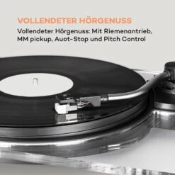 Da der Pureness Plattenspieler einen integrierten Vorverstärker besitzt, ist er sofort abspielbereit und besonders interessant für Musikliebhaber, die ein unkompliziertes Gerät wünschen. Außerdem lässt er sich mit einem RCA-Kabel an eine Anlage anschließen. Der auna Pureness Plattenspieler ist allerdings nicht nur eine Freude für die Ohren: Die schlichte Eleganz des Chassis aus Acrylglas begeistert die Augen und ist ein echter Hingucker im Wohnzimmer.