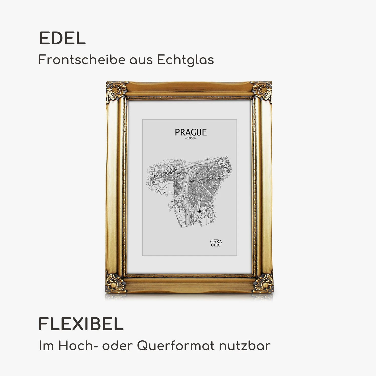 Die Regent Bilderrahmen von Casa Chic by blumfeldt sind aus Echtholz gefertigt und mit Gipsornamenten bestückt. Sie bringen deine Fotos und Bilder sowohl im Hoch- als auch im Querformat ideal zur Geltung. Dabei bildet das aufwendig gestaltet Rahmenprofil im Rokoko-Design einen wunderschönen Kontrast zu modernen Einrichtungen. Gestalte Wandcollagen oder arrangiere deine Lieblingsfotos auf dem Sideboard oder im Regal. Das mitgelieferte Passepartout überlässt dir die Wahl des passenden Bildausschnitts. Die Echtglasscheibe schützt nicht nur vor Staub und Schmutz, sie vervollständigt gekonnt den edlen Look der Regent Rahmen.