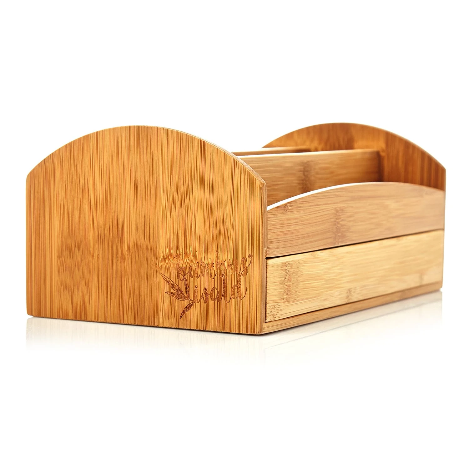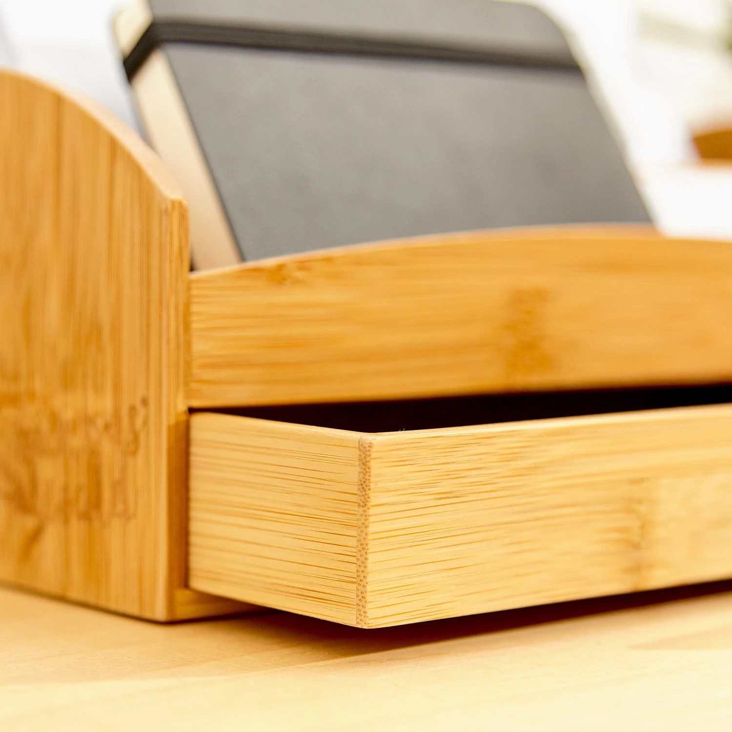Dabei kann der Schreibtischorganizer mit Schublade noch mehr als nur Ordnung schaffen: Er ist ein moderner Hingucker und bringt natürlichen Glanz ins Büro. Durch die Herstellung aus reinem Bambus ist die Schreibtischbox wunderschön und nachhaltig. Ihr zeitlos ästhetisches Aussehen wird durch die abgerundeten Kanten zusätzlich untermalt.