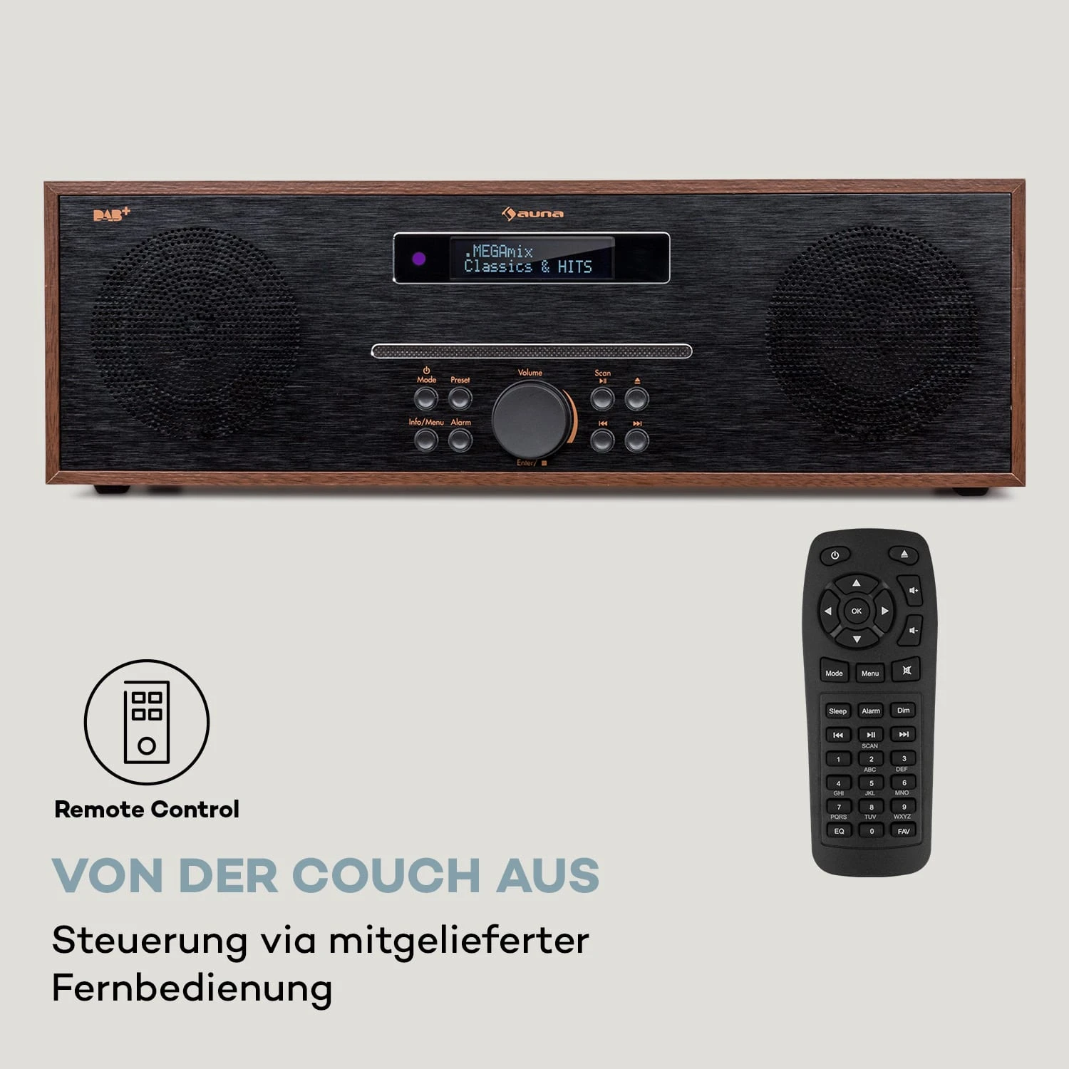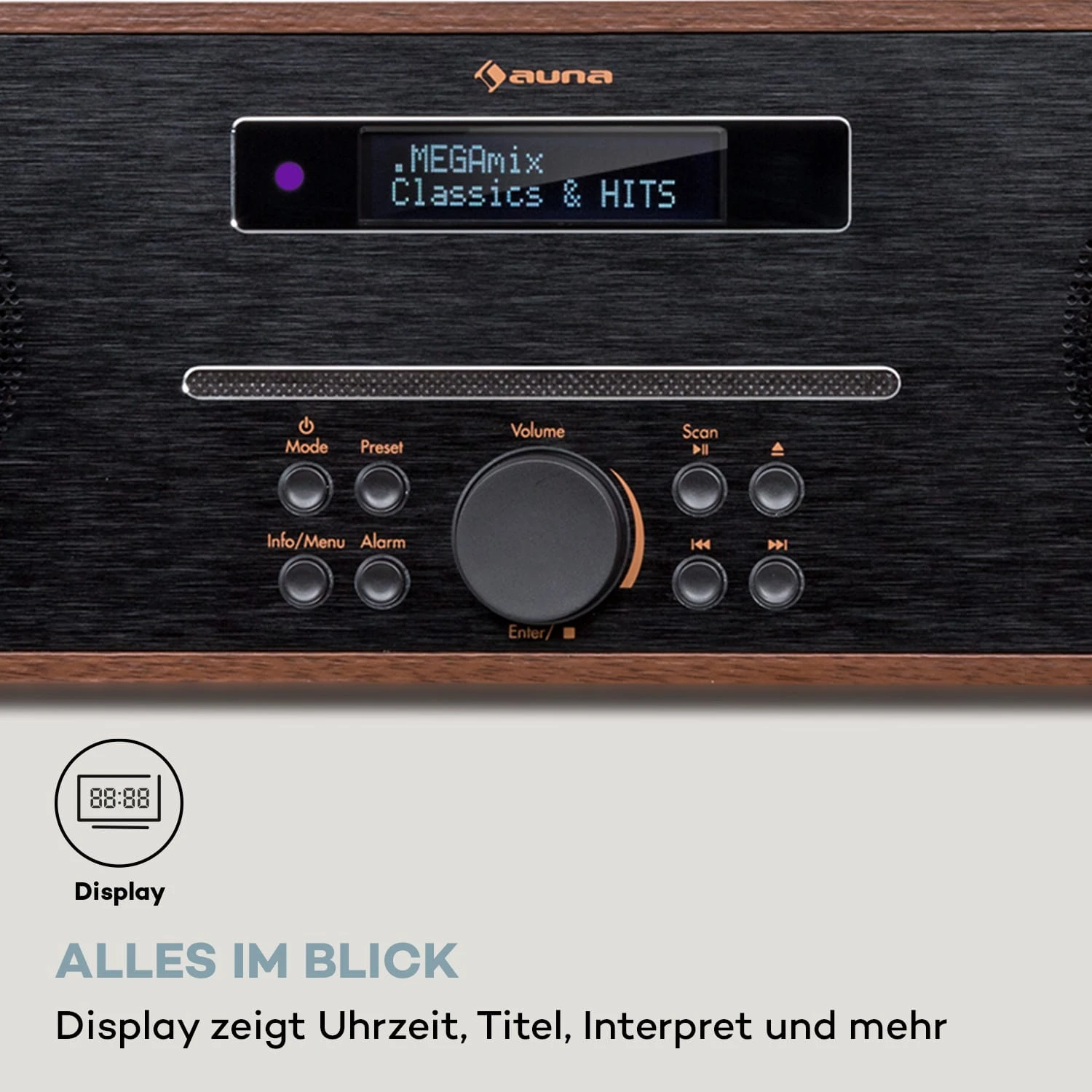 Das elegante SolidSteel-Design mit einem Frontpanel aus gebürstetem Aluminium und einem Gehäuse in Holzoptik wird in jedem Wohnambiente zum dezenten Blickfang. Informationen wie Zeit, Titel oder Interpret werden zuverlässig und klar auf dem Display angezeigt, sodass du nichts mehr verpasst. Die Bedienung erfolgt direkt am CD-Player oder bequem per Fernbedienung vom Sofa aus.