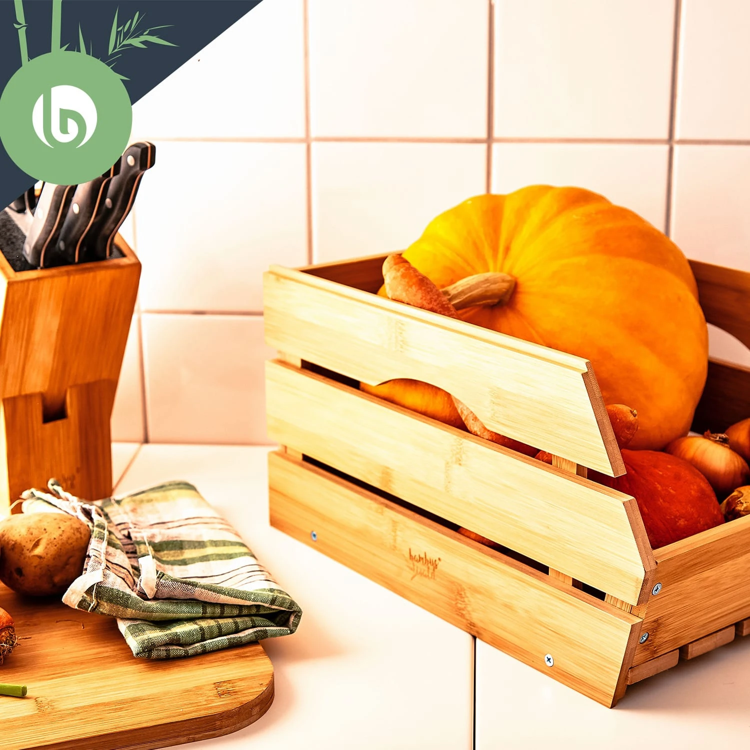 Stilvoll Ordnung schaffen – das kann die Stapelkiste aus Bambus auf ganz hervorragende Weise. Allerlei lose Gegenstände finden ihren Platz in der modernen Aufbewahrungsbox und sind dort gut aufgehoben. Dank der offenen Gestaltung hast du immer einen guten Überblick über deine Dinge und Vorräte und kannst diese schnell erreichen. Ebenso ist eine hohe Luftzirkulation gegeben, wodurch sich die Stapelkiste optimal zur Lagerung von Obst- und Gemüsevorräten eignet. Ideal ist sie auch zur Präsentation von Waren auf dem Wochenmarkt oder am Obststand geeignet. Dank der raffinierten Stapelfunktion kannst du dir aus wenigen Kisten ein schönes Regal kreieren – und das ganz ohne Schrauben und Bohren. Dabei bieten die seitlichen Einkerbungen als Griffe hohen Tragekomfort.