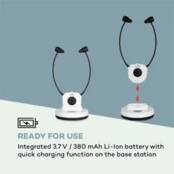 Noch komfortabler wird der auna Stereoskop Funk-Kopfhörer durch seine Befreiung von lästigen Kabeln. Einzig die Basisstation muss mit dem Fernseher, der Stereoanlage, dem Computer oder einem CD- oder MP3-Player über ein 3,5 mm Klinken-Kabel verbunden werden. Dank einfachem Plug & Play Anschluss muss danach nur noch der Kopfhörer eingeschaltet werden und schon geht die Übertragung los – keine komplizierten Einstellungen oder Installationen notwendig. Das Audiosignal wird per Digital-Funk im 2,4 GHz Bereich an die Kopfhörer übertragen. Es durchdringt dabei Wände, Türen oder Decken und besitzt eine Reichweite von bis zu 20 Metern, sodass Sie sich ausgesprochen frei in Ihren vier Wänden bewegen und trotzdem Musik hören können. Damit der auna Stereoskop Kinnbügelkopfhörer dauerhaft einsatzbereit ist, wurde ein leistungsstarker 3,7 V / 380 mAh Lithium-Ionen-Aku direkt eingebaut, der unkompliziert geladen wird, sobald der Kopfhörer in die Basisstation gesteckt wird.
