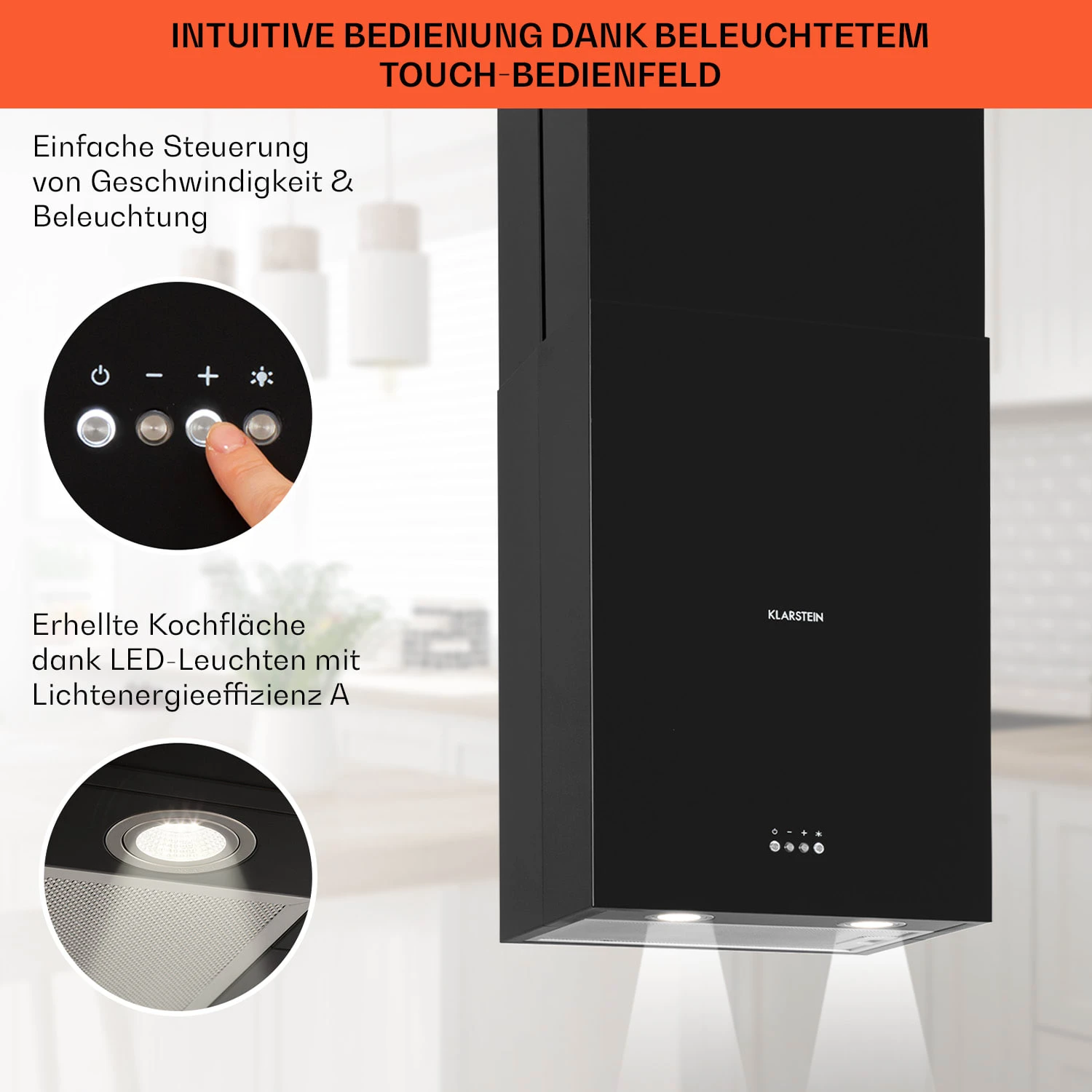Die Structura Dunstabzugshaube von Klarstein: Stilvoller Blickfang, helle Kochflächenbeleuchtung und leistungsstarker Dunst- und Geruchsneutralisierer in einem Gerät.
