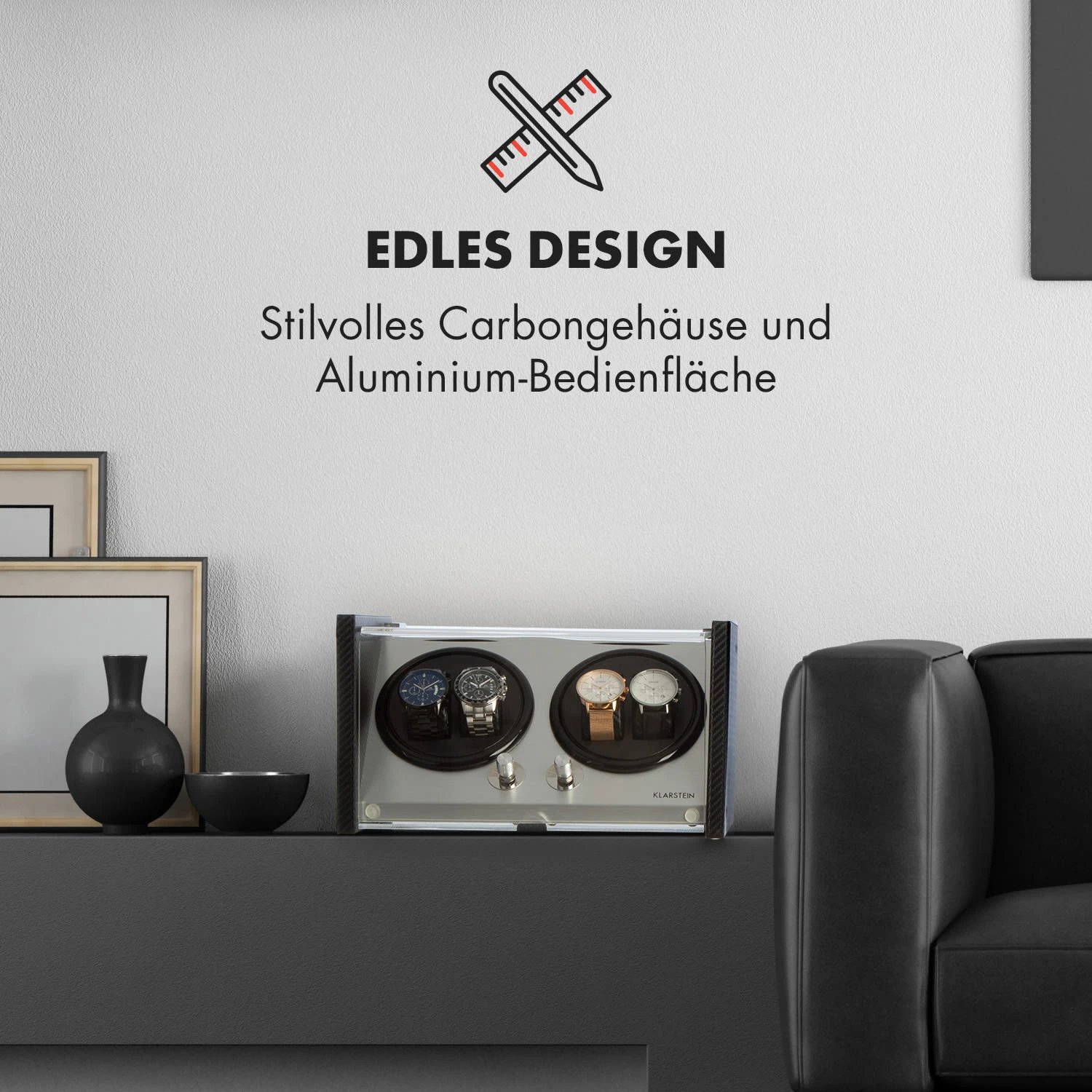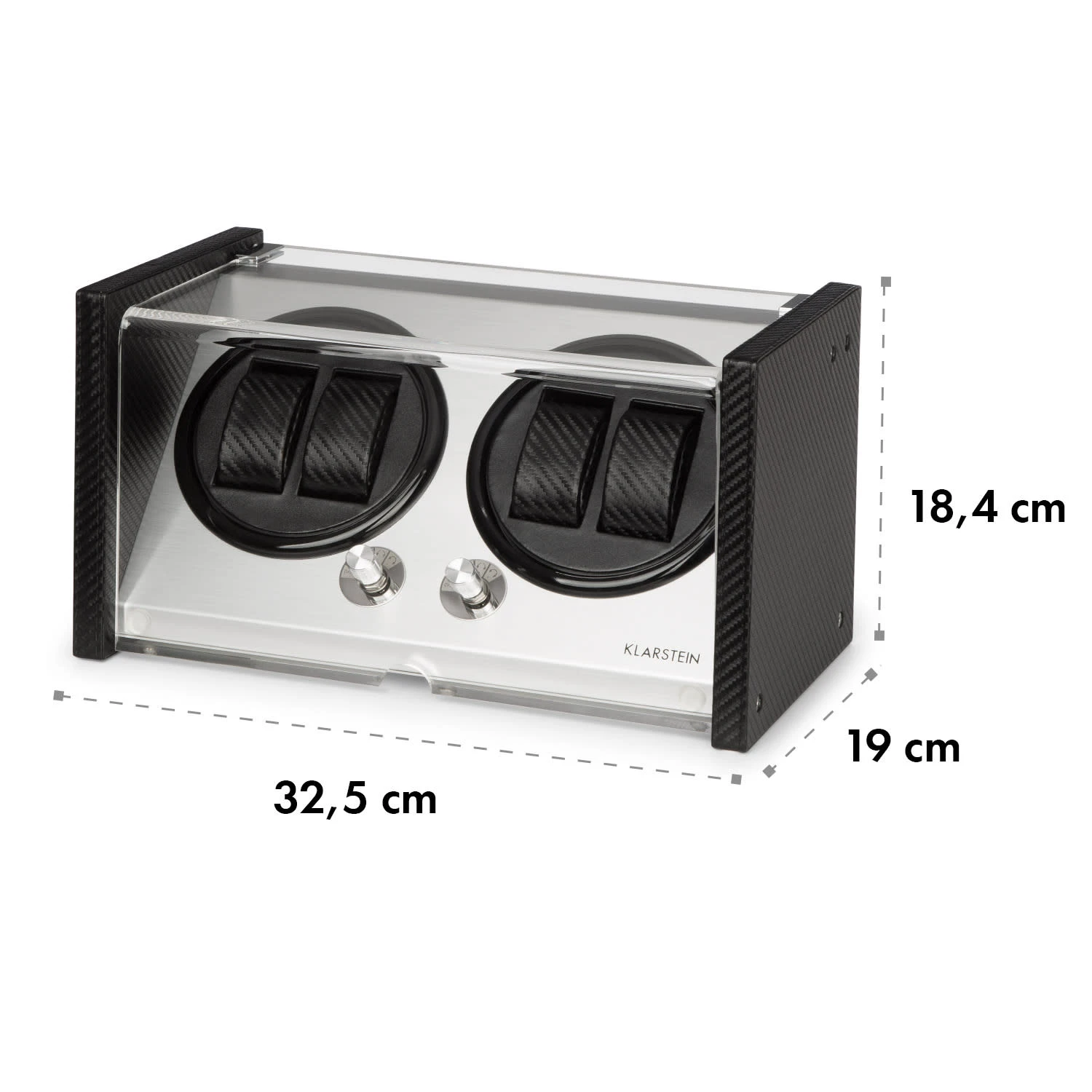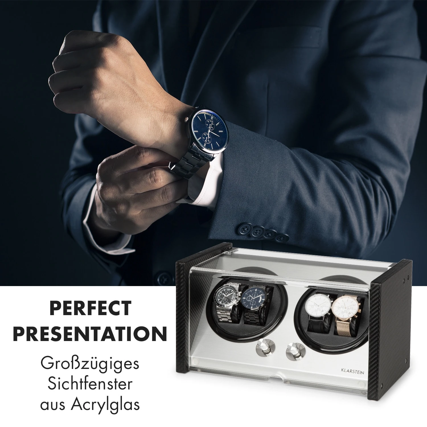 Der Tokyo 4 Uhrenbeweger überzeugt mit einem eleganten Gehäuse im Carbonfaser-Look, das sich stilvoll in jedes Raum-Ambiente einfügt. Eine Bedienfläche aus gebürstetem Aluminium verleiht der Konstruktion seinen unverwechselbaren Glanz, währende das großzügig geschnittene, von oben und frontal einsehbare Sichtfenster aus Acrylglas einen unverstellten Blick auf die Automatikuhren freigibt.