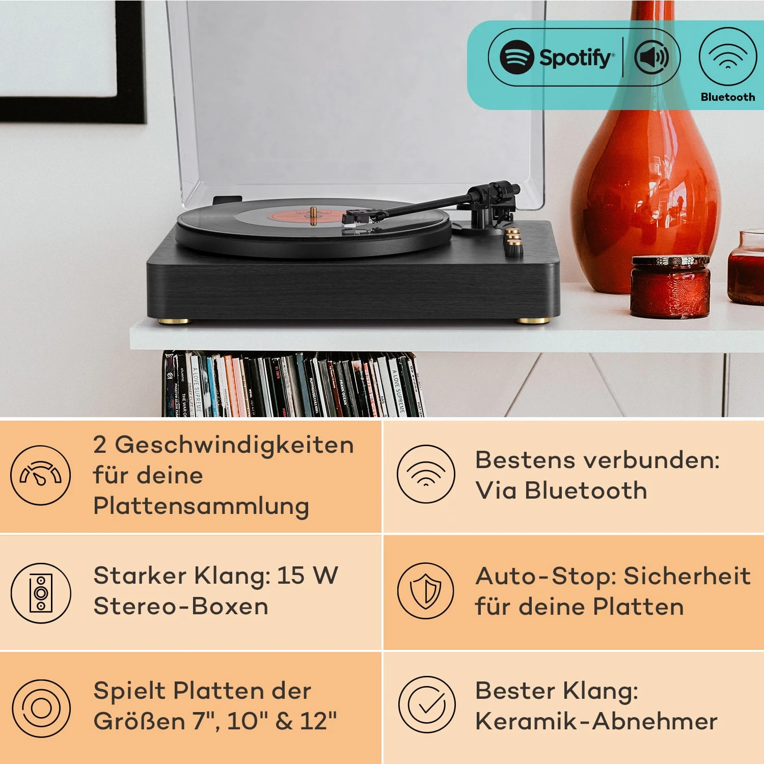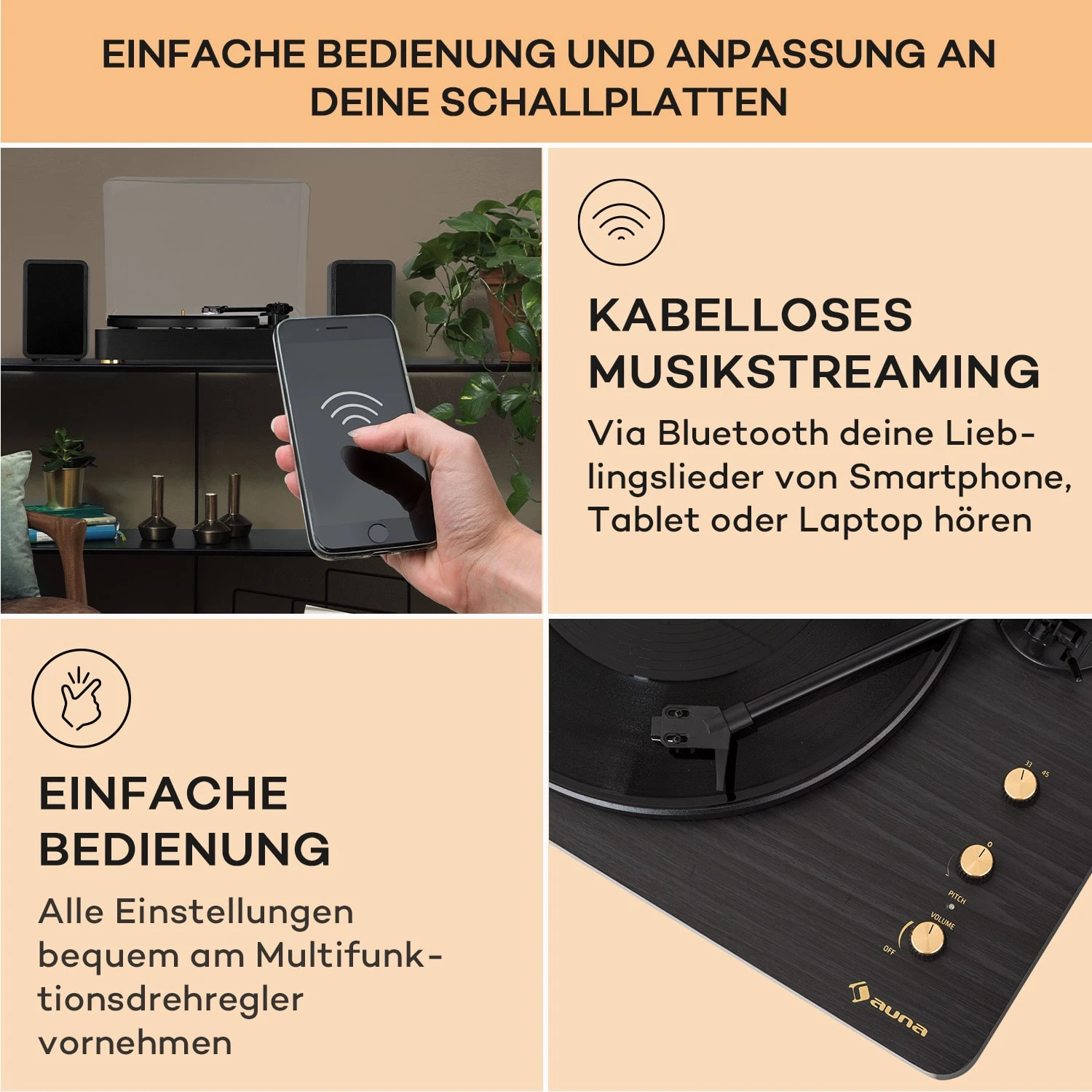 - Bluetooth-Schnittstelle ermöglicht Wiedergabe von Musikdateien über den Plattenspieler