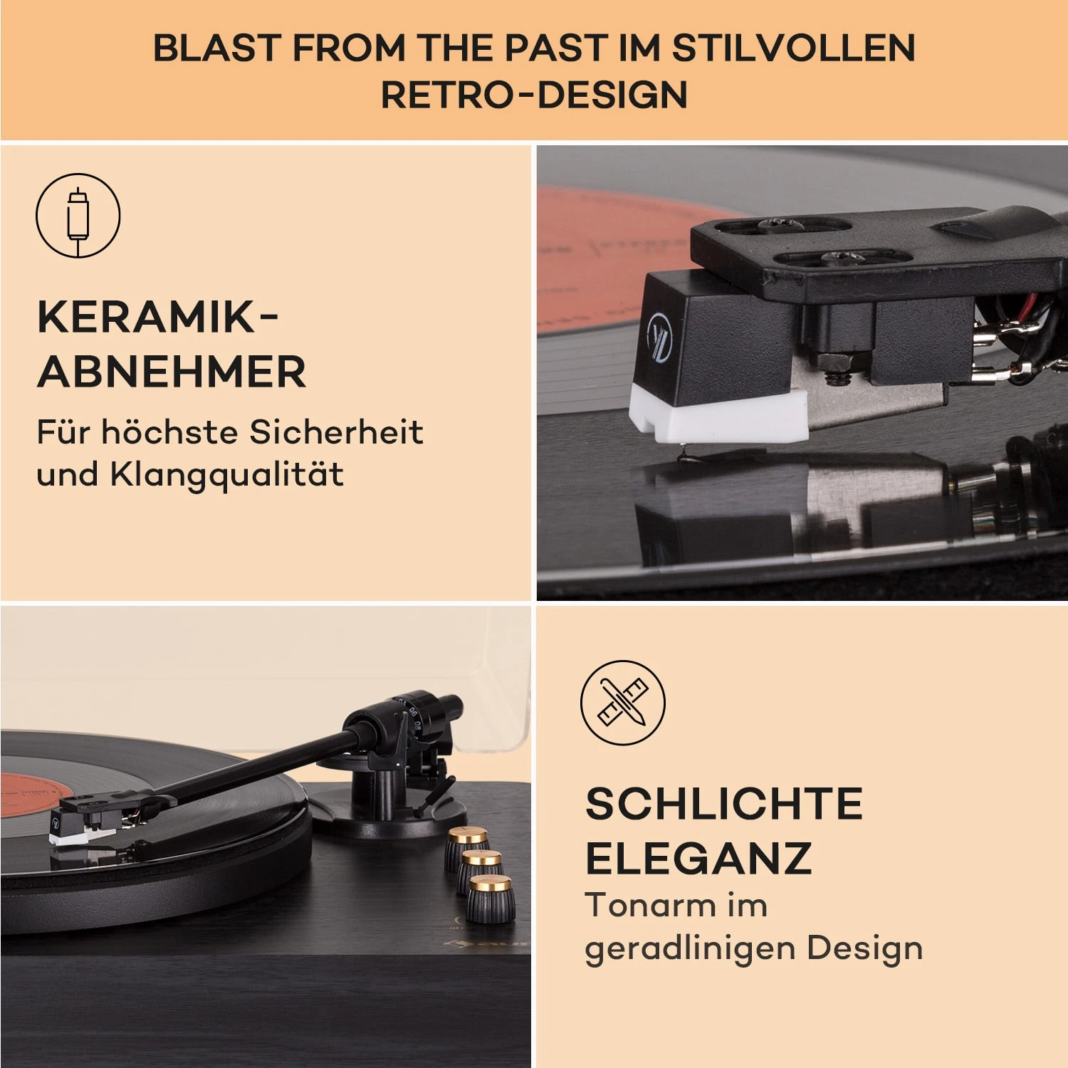- 2 Geschwindigkeiten: 33 1/3 & 45 Umdrehungen pro Minute
