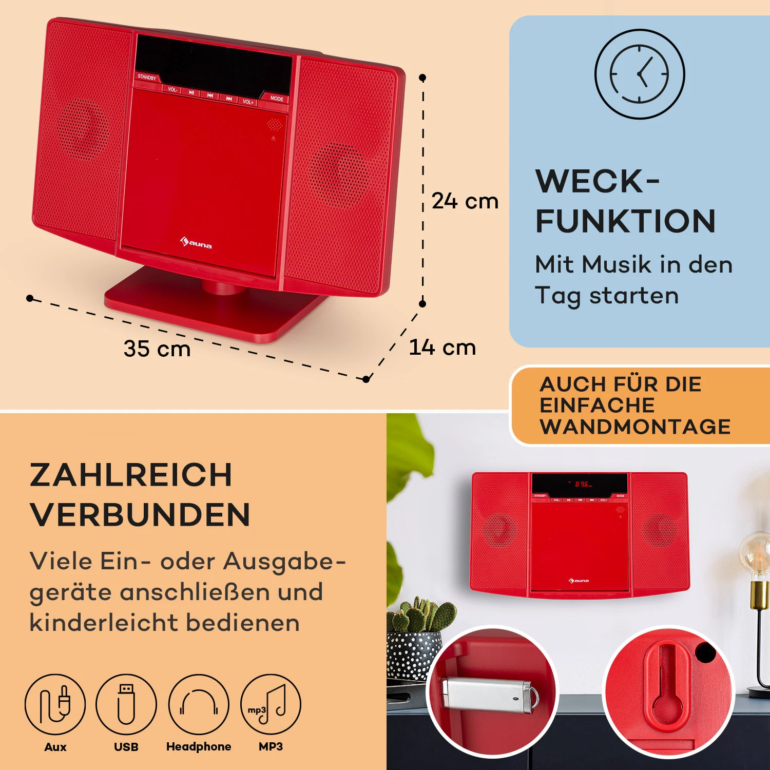 - Anschlüsse: 1 x USB-Port, 1 x 3,5 mm-Klinken-AUX-Eingang, 1 x 3,5 mm-Klinken-Kopfhörer-Ausgang