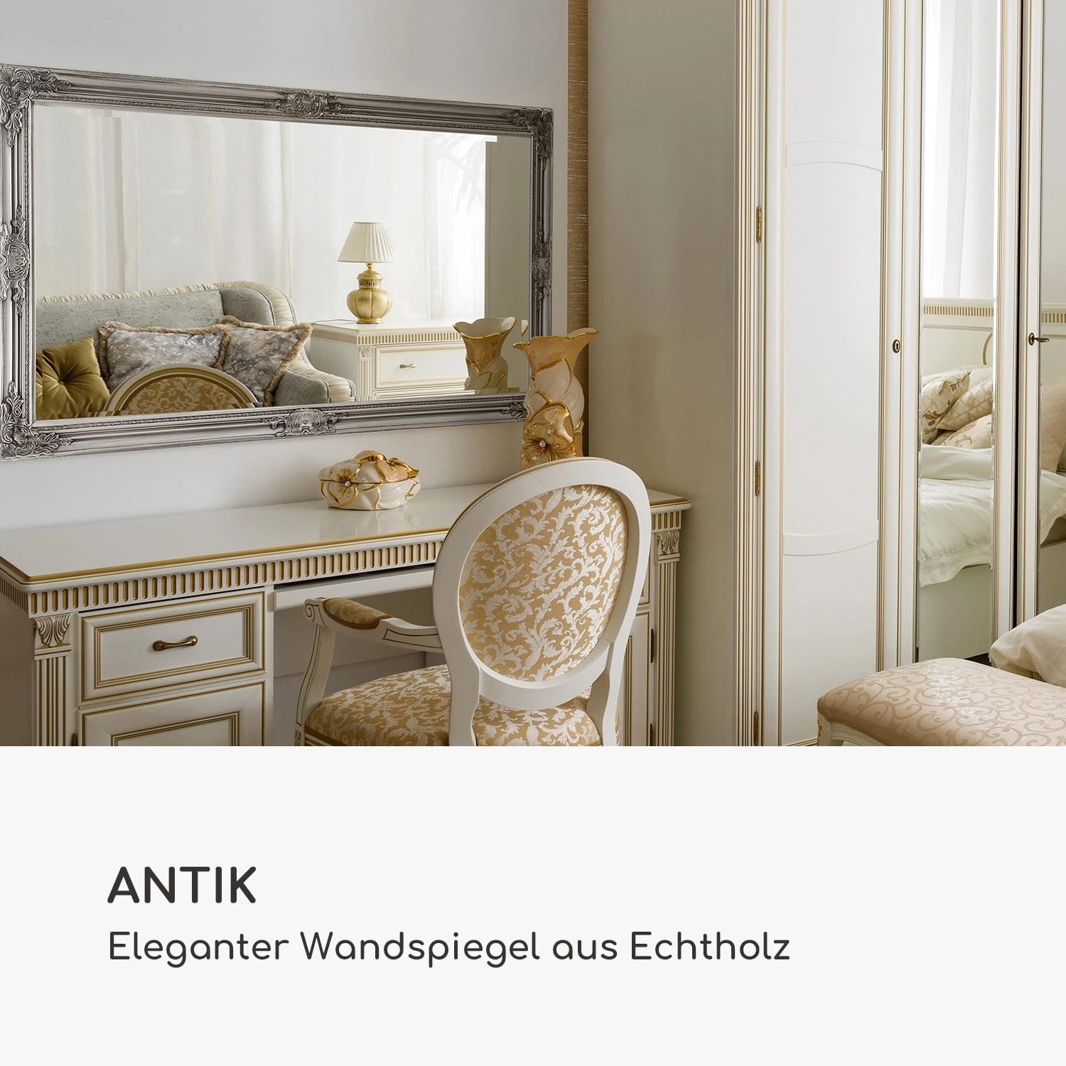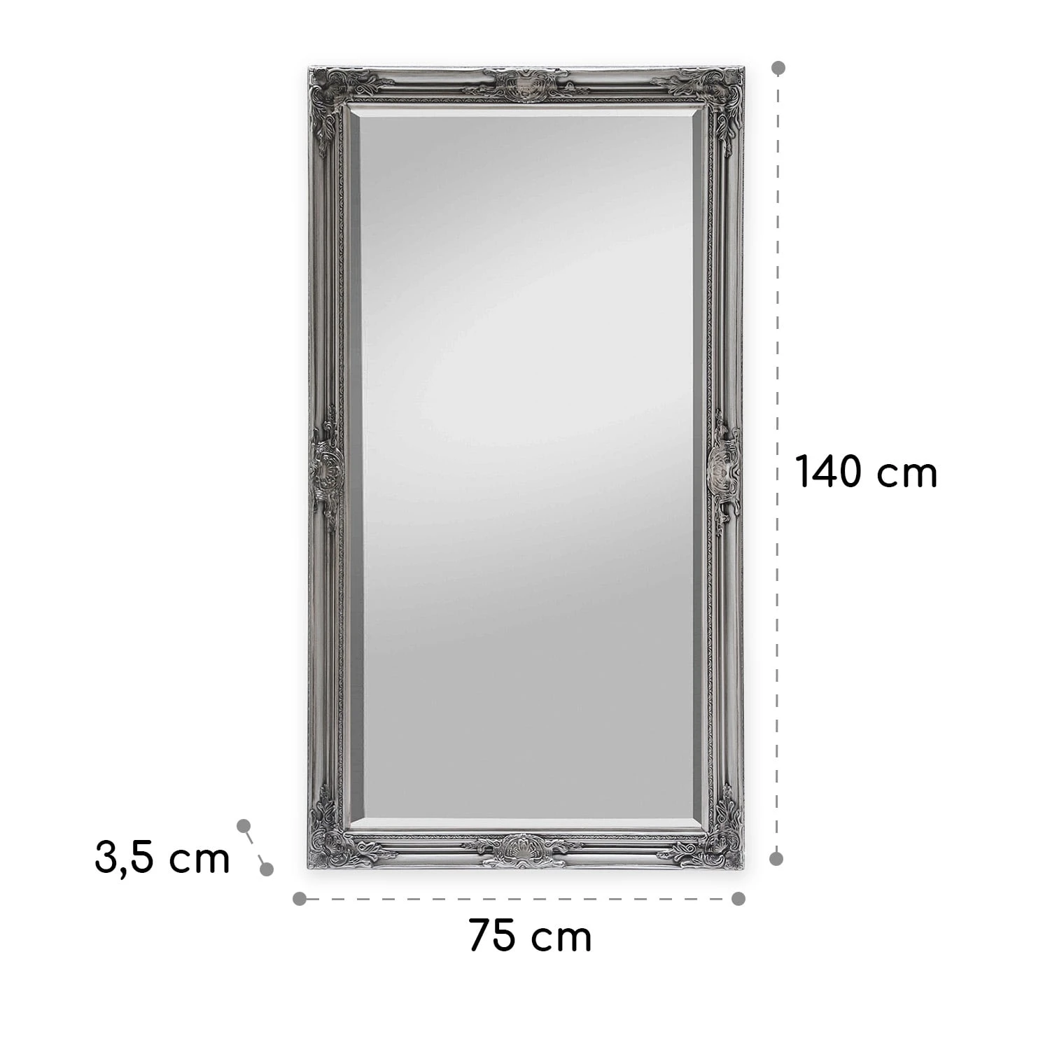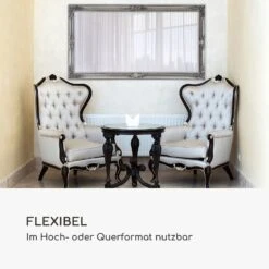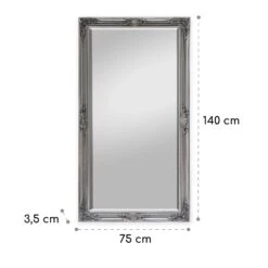 Der exklusive Wandspiegel Wembley von Casa Chick by blumfeldt verleiht jedem Raum einen luxuriösen Hauch von Rokoko. Kunstvolle Verzierungen säumen den gesamten Rahmen des Spiegels – durch zarte Formen und Linien wirken diese dezent pompös und sind ein wunderschönes Detail für alle Liebhaber antiker Epochen. Dank seiner Größe ist der elegante Spiegel ideal für den Eingangsbereich, das Wohn- oder auch das Schlaf- und Ankleidezimmer in deinem Zuhause. Du kannst ihn sowohl im Quer- als auch im Hochformat aufhängen. Ebenso kannst du ihn auch stehend nutzen und deinen Raum mit ihm dekorativ gestalten. Rückseitig sind die entsprechenden Aufhängungen für eine sichere Montage an der Wand bereits vorhanden. Das hochwertige Spiegelglas in 4 mm Stärke schenkt dir ein realistisches Spiegelbild. Das Glas verfügt über konisch geschliffene Kanten, welche die Exklusivität des Spiegels gekonnt untermalen.