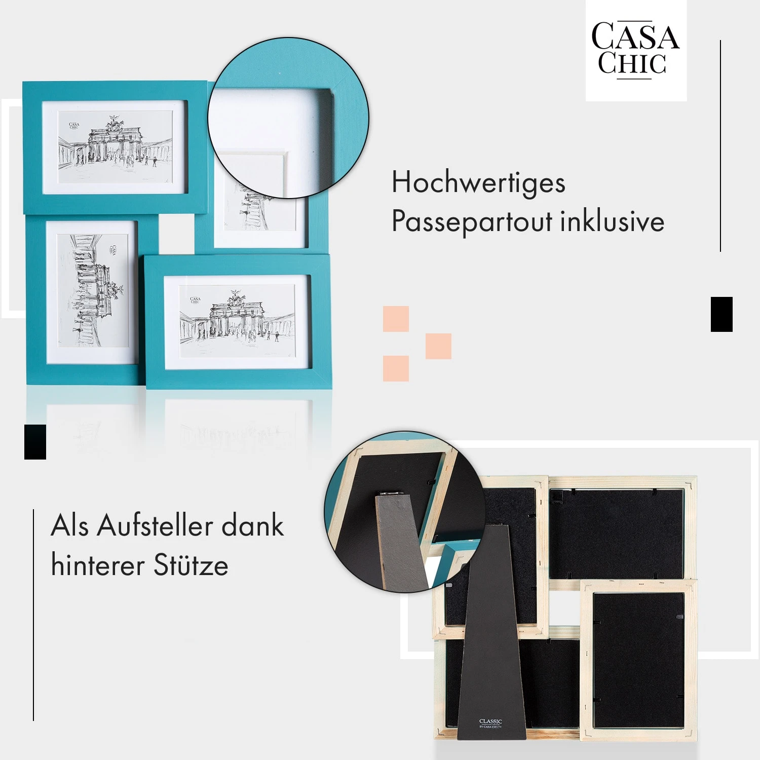 Gestalte dein Zuhause bunt und lebendig: Der Woodford Bilderrahmen von Casa Chic by blumfeldt fügt 4 Bilder collagenartig in seinem Echtholzrahmen zusammen. Die 4 geschickt verbundenen Einzelrahmen verfügen alle über ein Passepartout, somit hast du die Wahl zwischen zwei unterschiedlichen Bildformaten. Flexibel bleibst du auch bei der Standortfrage: Ob als Aufsteller auf dem Sideboard, im Regal oder als Wandbilderrahmen, der Woodford macht überall eine gute Figur und umschließt mit seinem schlichten Rahmenprofil und der Frontscheibe aus Echtglas deine schönsten Erinnerungen.