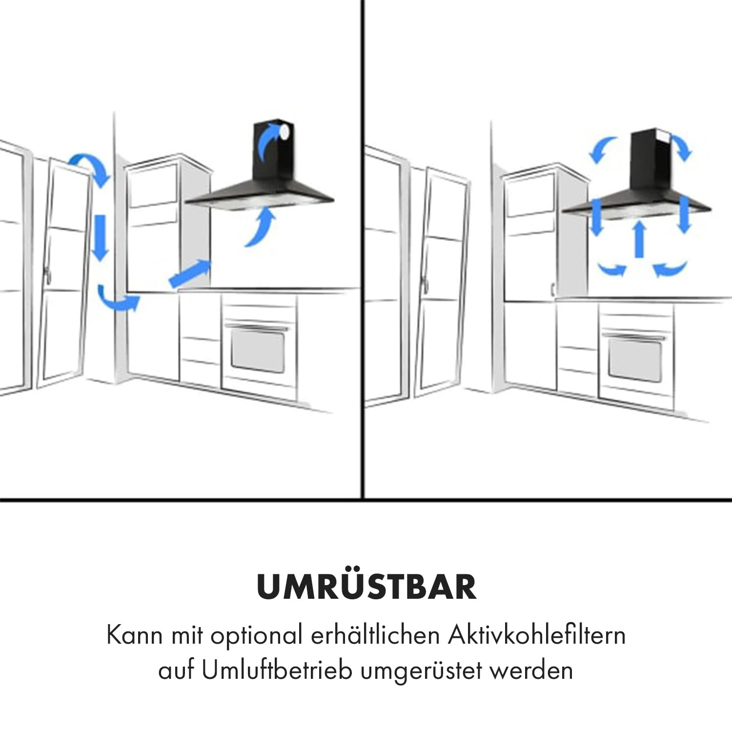 Die Dunstabzugshaube kann mit Hilfe von einem Aktivkohle-Filter (Artikel 10027451) auf Umluft-Betrieb umgerüstet werden.